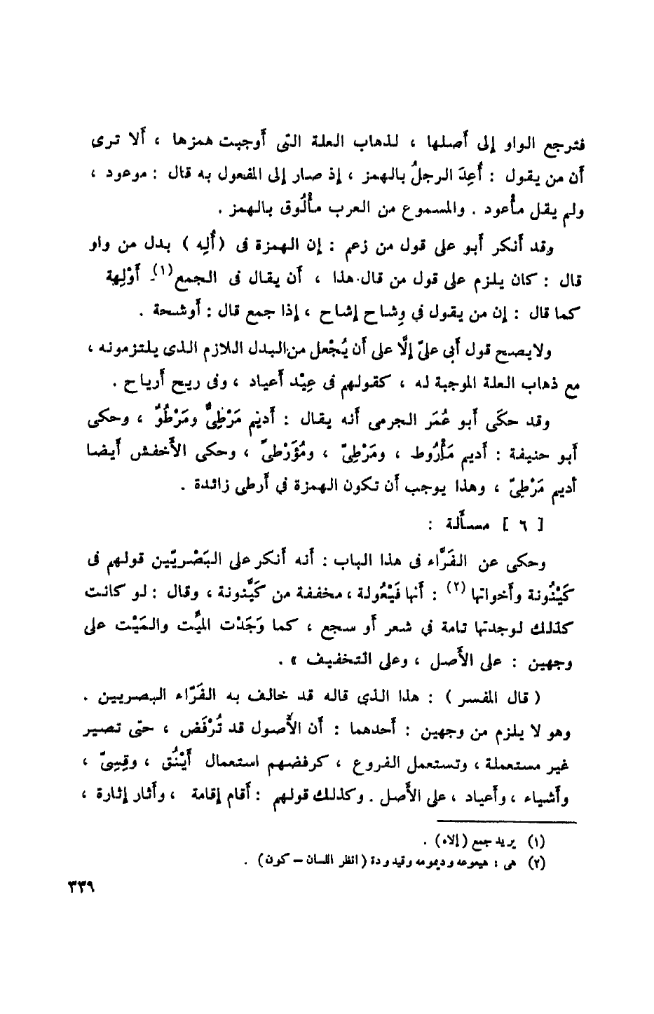 (قال المفسر): هذا الذي قاله قد خالف به الفراء البصريين، وهو لا يلزم من وجهين: أحدهما: أن الأصول قد ترفض، حتى تصير غير مستعملة، وتستعمل الفروع، كرفضهم استعمال أينق، وقسى، وأشياء، وأعياد، على الأصل. وكذلك قولهم: أقام إقامة، وأثار إثارة،