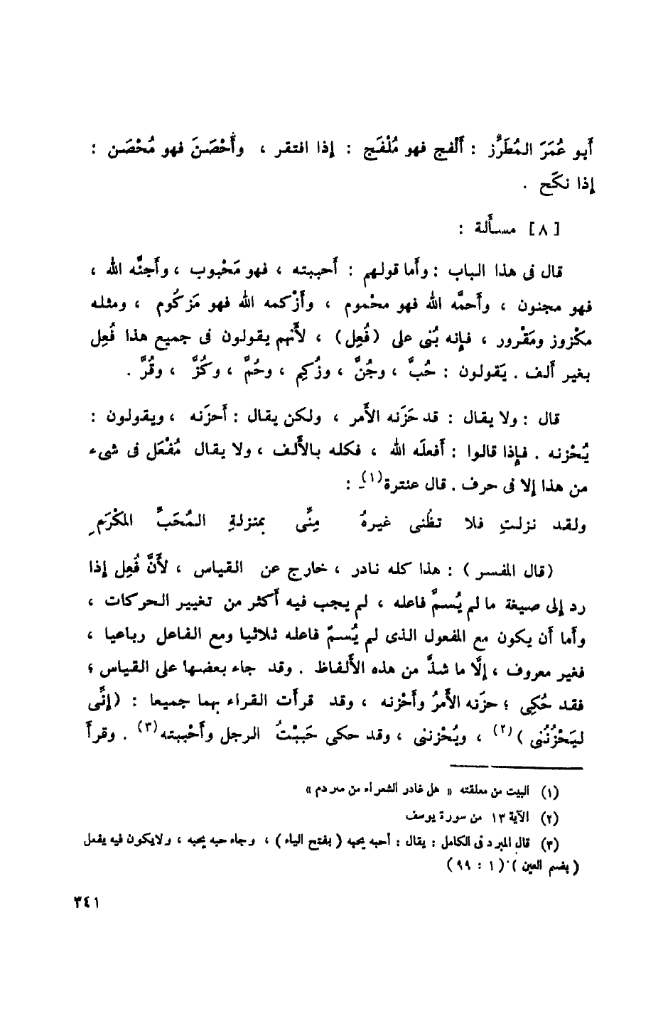 (قال المفسر): هذا له نادر، خارج عن القياس، لأن فعل إذا رد إلى صيغة ما لم يسم فاعله، لم يجب فيه أكثر من تغيير الحركات، وأما أن يكون مع المفعول الذي لم يسم فاعله ثلاثياً ومع الفاعل رباعيا، فغير معروف، إلا ما شذ من هذه الألفاظ. وقد جاء بعضها على القياس، فقد حكى، حزنه الأمر وأحزنه، وقد قرأت القراء بهما جميعاً: (إني ليحزنني)، ويحزنني، وقد حكى حببت الرجل وأحببته. وقرأ