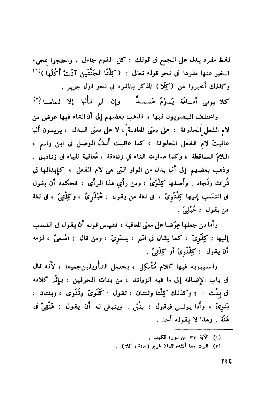 لفظ مفرد يدل على الجمع في قولك: كل القوم جاءني، واحتجوا بمجيء الخبر عنها مفرداً في نحو قوله تعالى: (كلتا الجنتين آتت أكلها) وكذلك أخبروا عن (كلا) المذكر بالمفرد في نحو قول جرير.