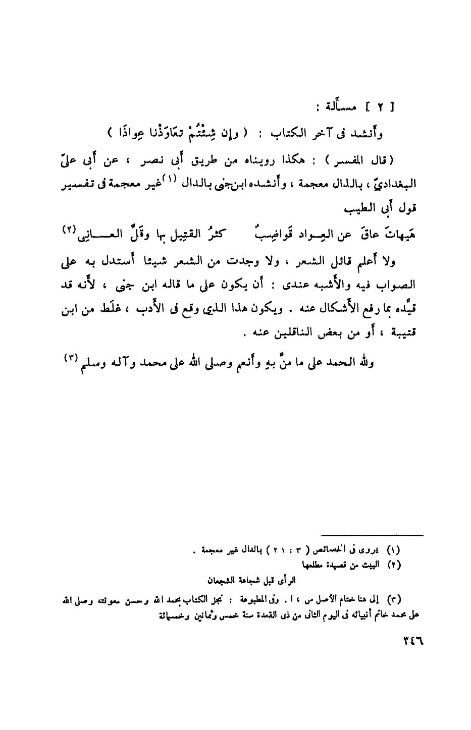 ولا أعلم قائل الشعر، ولا وجدت من الشعر شيئاً أستدل به على الصواب فيه والأشبه عندي: أن يكون على ما قاله ابن جني، لأنه قد قيده بما رفع الأشكال عنه. ويكون هذا الذي وقع في الأدب، غلط من ابن قتيبة، أو من بعض الناقلين عنه.
