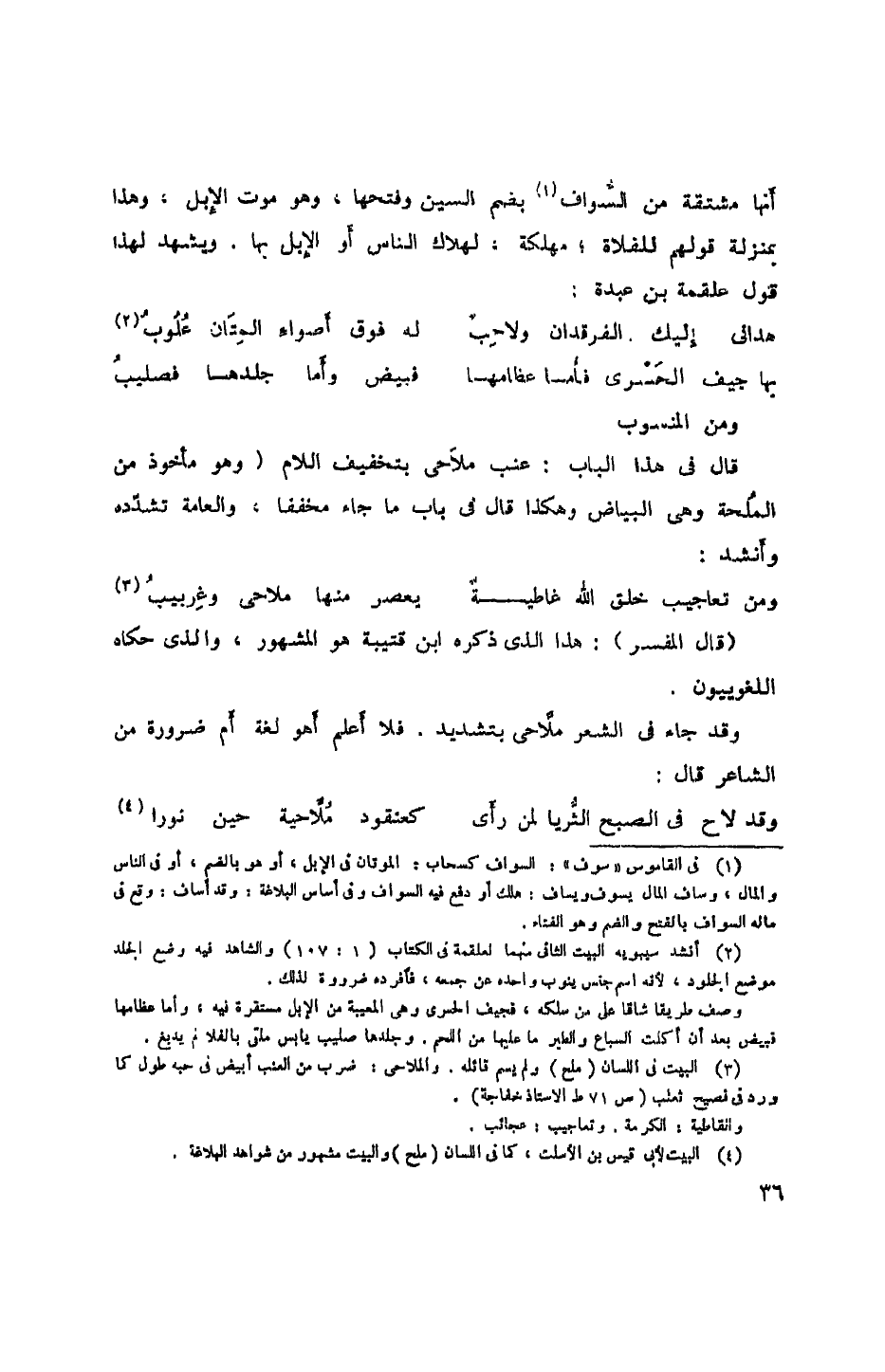 قال في هذا الباب: عنب ملاحي بتخفيف اللام (وهو مأخوذ من الملحة وهي البياض وهذا قال في باب ما جاء مخففاً، والعامة تشدده وأنشد: