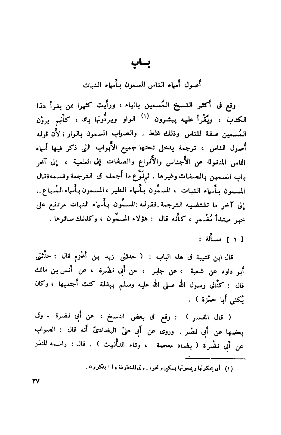 وقع في أكثر النسخ المسمين بالياءن ورأيت كثيراً ممن يقرأ هذا الكتاب، ويُقرأ عليه يبشرون الواو ويردونها ياء، كأنهم يرون المسمين صفة للناس وذلك غلط. والصواب المسمون بالواو؛ لأن قوله أصول الناس، ترجمة يدخل تحتها جميع الأبواب التي ذكر فيها أسماء الناس المنقولة عن الأجناس والأنواع والصفات إلى العلمية، إلى آخر باب المسمين بالصفات وغيرها. ثم نوع ما أجمله في الترجمة وقسمه فقال المسمون بأسماء النبات، المسمون بأسماء الطير، المسمون بأسماء السباع إلى آخر ما تقتضيه الترجمة. فقوله: المسمون بأسماء النبات مرتفع على خبر مبتدأ مضمر، كأنه قال: هؤلاء المسمون، وكذلك سائرها.