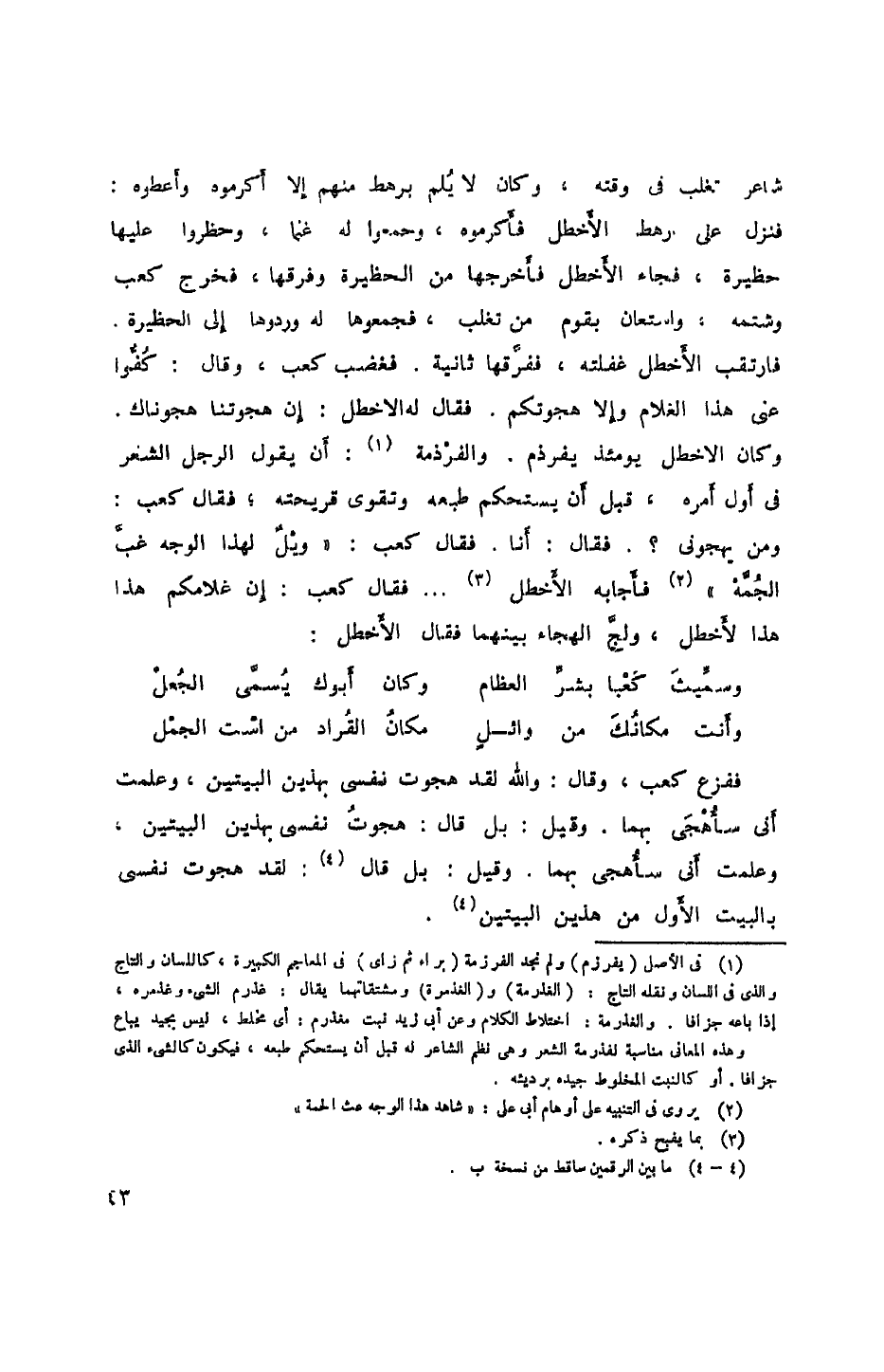 شاعر تغلب في وقته، وكان ايُلم برهط منهم إلا أكرموه وأعطوه: فنزل على رهط الأخطل فأكرموه، وجمعوا له غنما، وحظروا عيها حظيرة، فجاء الأخطل فأخرجها من الحظيرة وفرقها، فخرج كعب وشتمه، واستعان بقوم من تغلب، فجمعوها له وردوها إلى الحظيرة. فارتقب الأخطل غفلته، ففرقها ثانية. فغضب كعب، وقال كفوا عني هذا الغلام وألا هجوتكم. فقال له الأخطل: إن هجوتنا هوجناك. وكان الأخطل يومئذ يفرذم. والفرذمة: أن يقول الرجل الشعر في أول أمره، قبل أن يستحكم طبعه وتقوى قريحته، فقال كعب: ومن يهجوني فقال: أنا. فقال كعب: "ويل لهذا الوجه غب الجمه" فأجابه الأخطل .... فقال كعب: إن غلامكم هذا هذا لأخطل، ولج الهجاء بينهما فقال الأخطل: