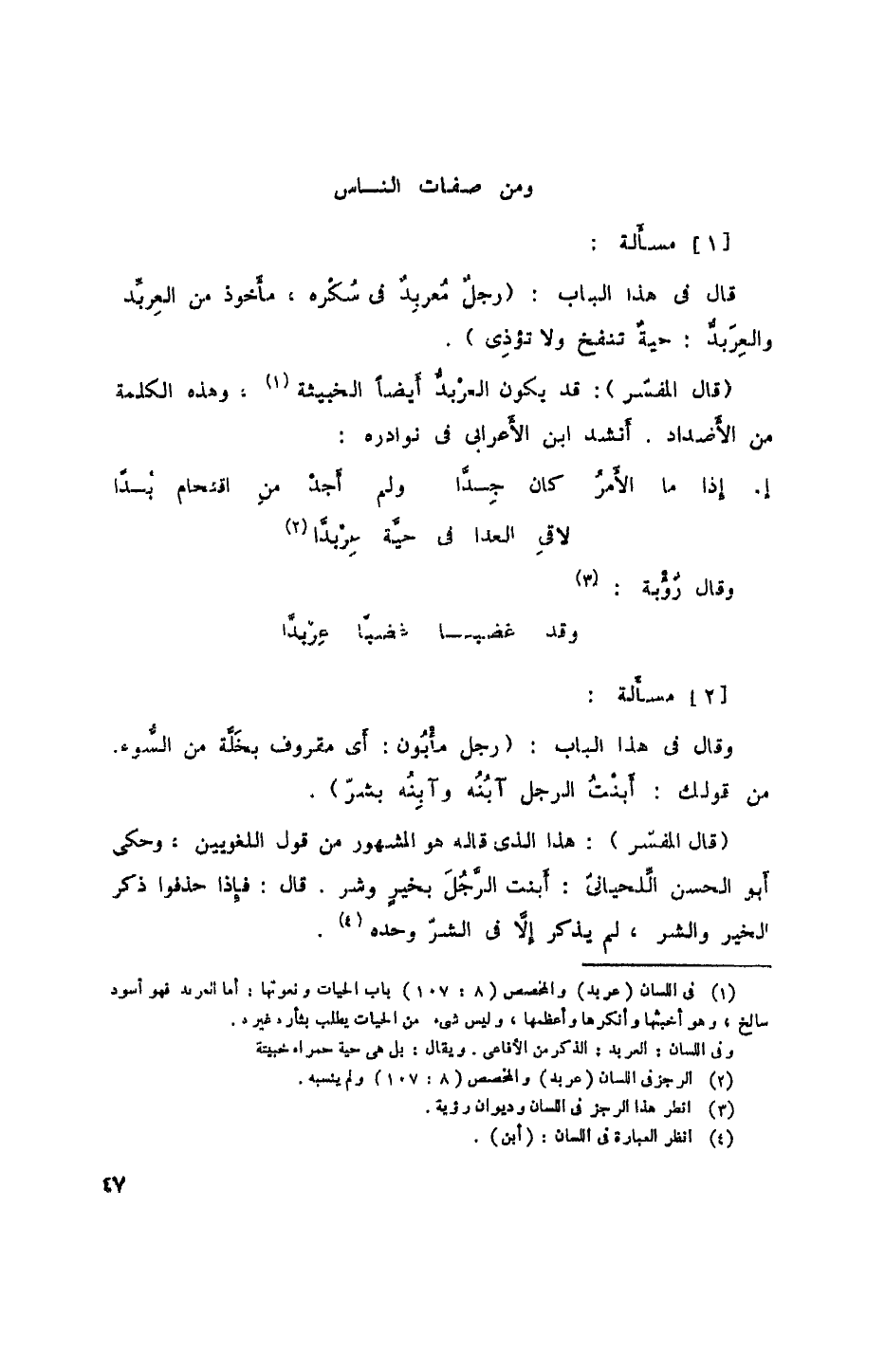 قال في هذا الباب: (رجل معربد في سكره، مأخوذ من العربد والعربد حية تنفخ ولا تؤذي).