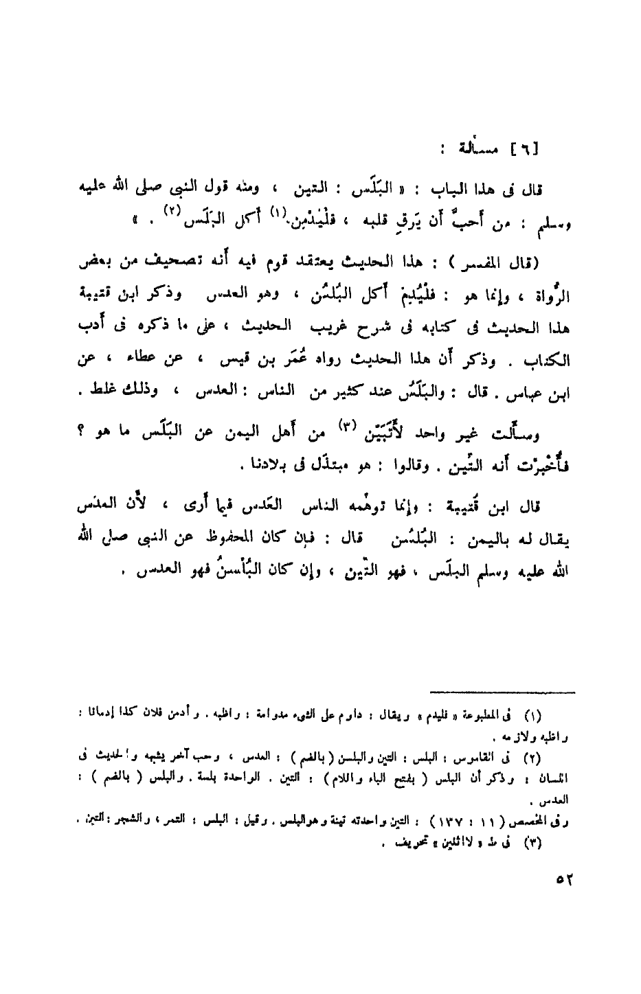 (قال المفسر 9: هذا الحديث يعتقد قوم فيه أنه تصحيف من بعض الرواة، وإنما هو: فليدم أكل البُلسن، وهو العدس وذكر ابن قتيبة هذا الحديث في كتابه في شرح غريب الحديث، على ما ذكره في أدب الكتاب. وذكر أن هذا الحديث رواه عمر بن قيسن عن عطاء، عن ابن عباس. قال: والبلس عند كثير من الناس العدس، وذلك غلط.