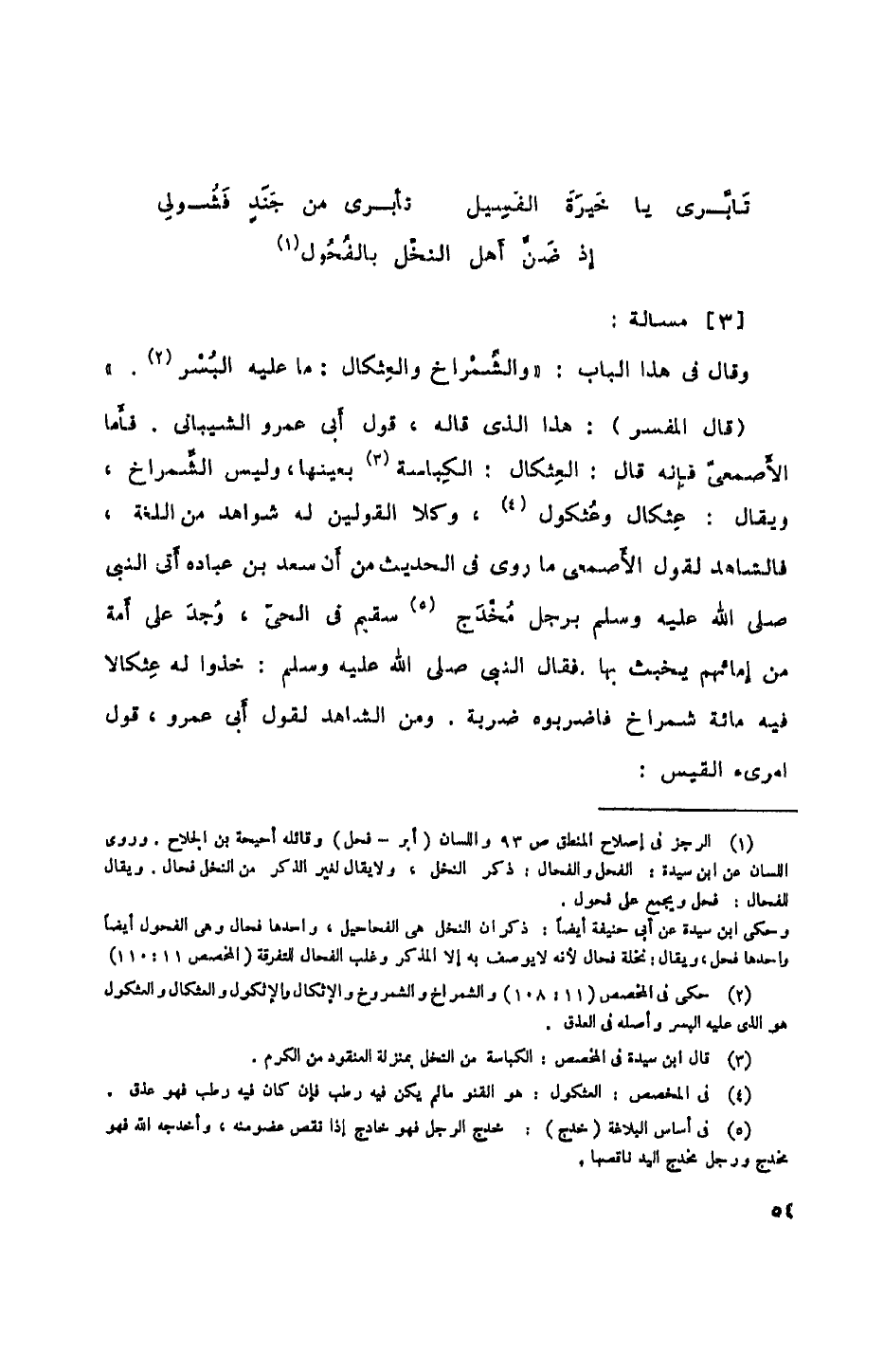 (قال المفسر): هذا الذي قاله، قول أبي عمرو الشيباني. فأما الأصمعي فإنه قال: العثكال: الكباسة بعينها، وليس الشمراخ، ويقال: عثكال وعثكول، وكلا القولين له شواهد من اللغة، فالشاهد لقول الأصمعي ما روى في الحديث من أن سعد بن عباده أتى النبي صلى الله عليه وسلم برجل مخدج سقيم في الحي، وجد على أمة من إمائهم يخبث بها، فقال النبي صلى الله عليه وسلم: خذوا له عثكالا فيه مائة شمراخ فاضربوه ضربة. ومن الشاهد لقول أبي عمرو، قول امريء القيس: