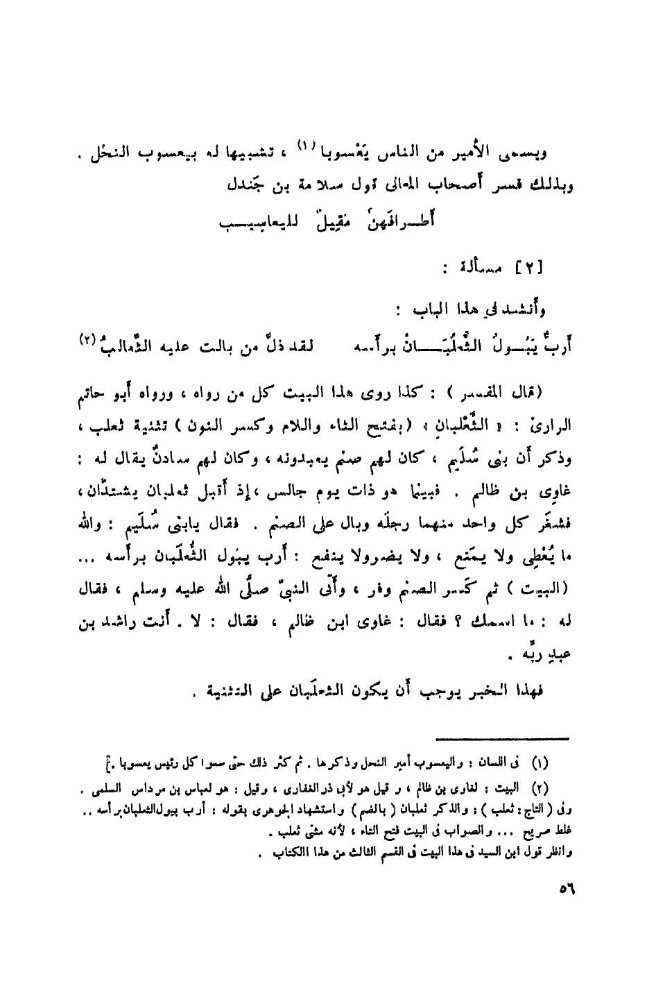 (قال المفسر): كذا روى هذا البيت كل من رواه، ورواه أبو حاتم الراري: "الثعلبان" (بفتح الثاء واللام وكسر النون) تثنية ثعلب، وذكر أن بني سليم، كان لهم صنم يعبدونه، وكان لهم سادن يقال له: غاوي بن ظالم. فبينما هو ذات يوم جالس، إذ أقبل ثعلبان يشتدان، فشغر كل واحد منهما رجله وبال على الصنم. فقال يا بني سليم: والله ما يعطي ولا يمنع، ولا يضر ولا ينفع: أرب يبول الثعلبان برأسه .. (البيت) ثم كسر الصنم وفر، وأتى النبي صلى الله عليه وسلم، فقال له: ما اسمك؟ فقال: غاوى ابن ظالم، فقال: لا. أنت راشد بن عبد ربه.