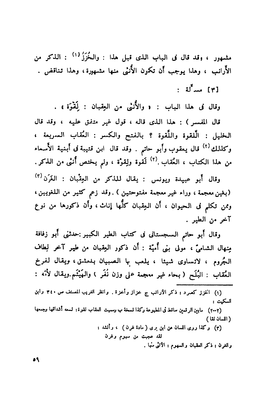 (قال المفسر): هذا الذي قاله، قول غير متفق عليه، وقد قال الخليل: اللقوة واللقوة؟ بالفتح والكسر: العقاب السريعة، وكذلك قال يعقوب وأبو حاتم. وقد قال ابن قتيبة في أبنية الأسماء من هذا الكتاب، العقاب. لقوة ولقوة، ولم يختص أنثى من الذكر.