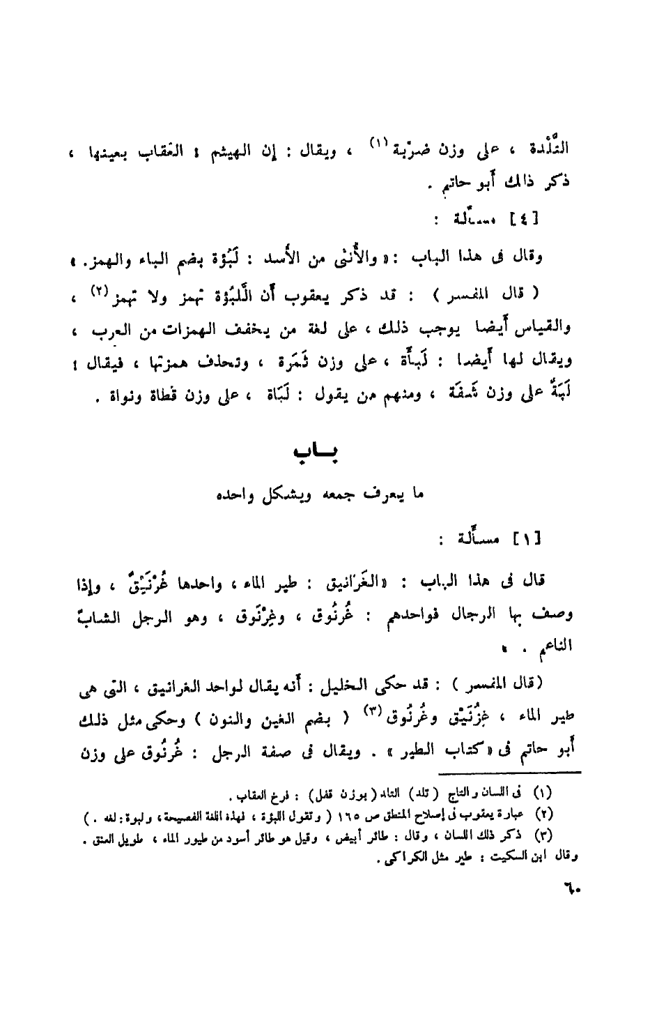 قال في هذا الباب: "الغرانيق: طير الماء، واحدها غرنيق، وإذا وصف بها الرجال فواحدهم: غرنوق، وغرنوق، وهوا لرجل الشاب الناعم".