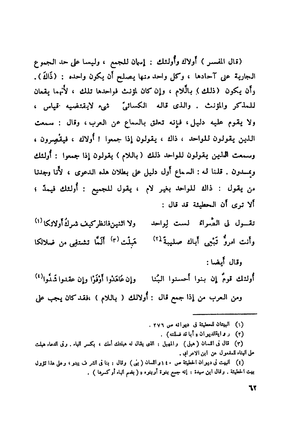 (قال المفسر) أولاك وأولئك: إسمان للجمع، وليسا على حد الجموع الجارية على آحادها، وكل واحد منها يصلح أن يكون واحده: (ذاك). وأن يكون (ذلك) باللام، وإن كان لمؤنث فواحدها تلك، لأنهما يقعان للمذكر والمؤنث. والذي قاله الكسائي شيء لا يقتضيه قياس، ولا يقوم عليه دليل، فإنه تعلق بالسماع عن العرب، وقال: سمعت الذين يقولون للواحد، ذاك، يقولون إذا جمعوا لأولاك، فيقصرون، وسمعت الذين يقولون للواحد ذلك (باللام) يقولون إذا جمعوا: أولئك ويمدون. قلنا له: السماع أول دليل على بطلان هذه الدعوى، لأنا وجدنا من يقول: ذاك للواحد بغير لام، يقول للجميع: أولئك فيمد؛ ألا ترى أن الحطيئة قد قال: