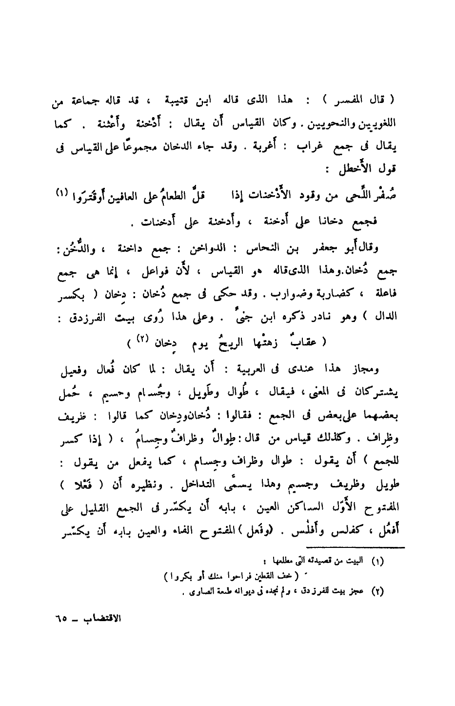 (قال المفسر): هذا الذي قاله ابن قتيبة، قد قاله جماعة من اللغويين والنحويين. وكان القياس أن يقال: أدخنة وأعثنة. كما يقال في جمع غراب: أغربة. وقد جاء الدخان مجموعاً على القياس في قول الخطل: