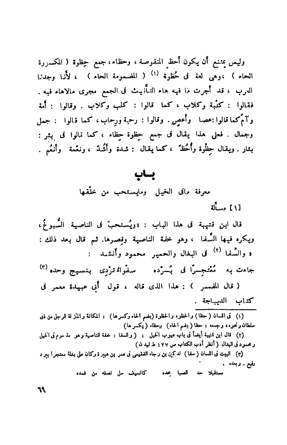 قال ابن قتيبة في هذا الباب: "ويستحب في الناصية السبوغ، ويره فيها السفا، وهو خفة الناصية وقصرها. ثم قال بعد ذلك: "والسفا في البغال والحمير محمود وأنشد: