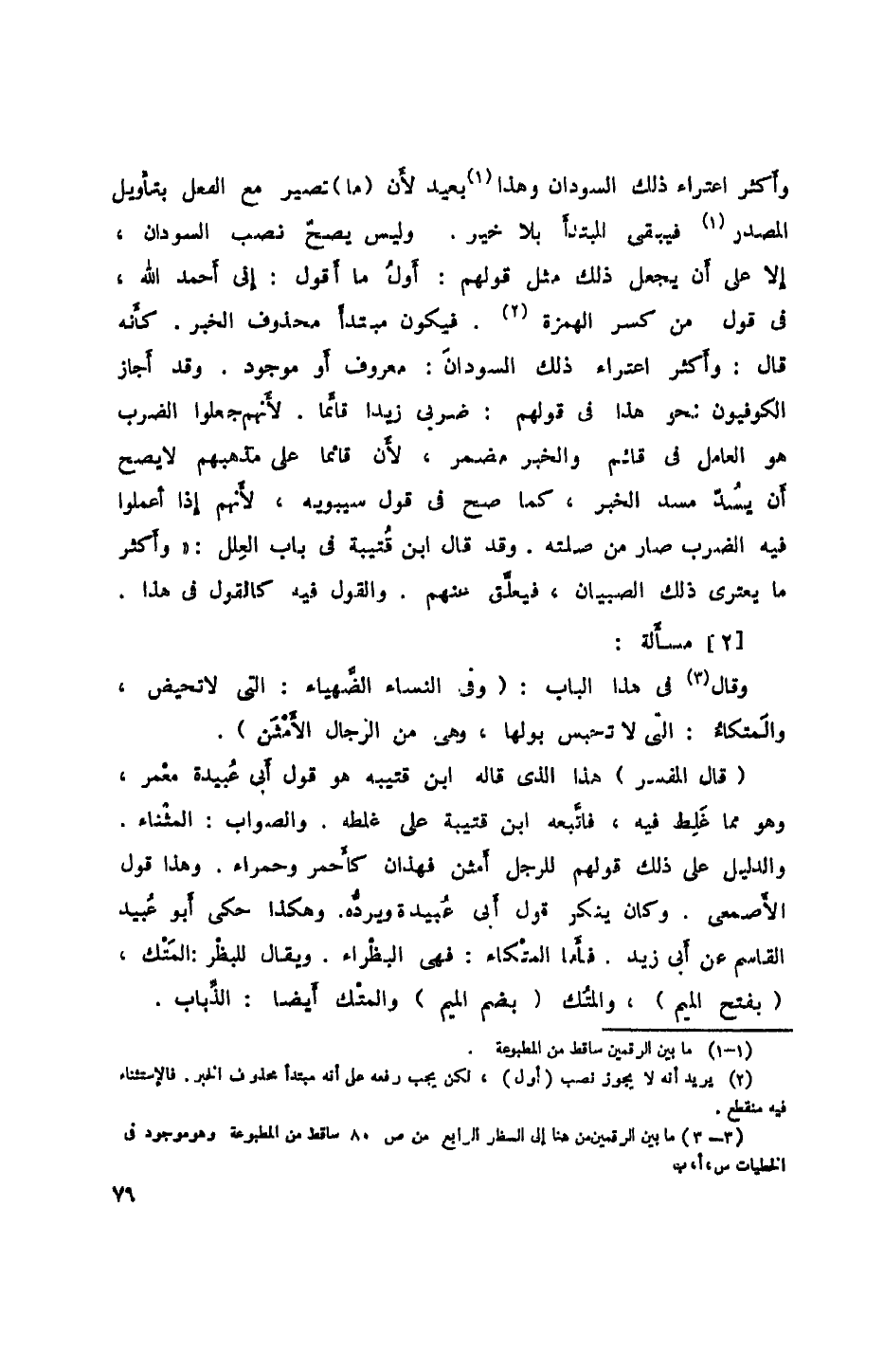 وأكثر اعتراء ذلك السودان وهذا بعيد لأن (ما) تصير مع الفعل بتأويل المصدر فيبقى المبتدأ بلا خير. وليس يصح نصب السودان، إلا على أن يجعل ذلك مثل قولهم: أول ما أقول: إني أحمد الله، في قول من كسر الهمزة. فيكون مبتدأ محذوف الخبر. كأنه قال: وأكثر اعتراء ذلك السودان: معروف أو موجود. وقد أجاز الكوفيون نحو هذا في قولهم: ضربي زيداً قائماً. لأنهم جعلوا الضرب هو العامل في قائم والخبر مضمر، لأن قائماً على مذهبهم لا يصح أن يسد مسد الخبر، كما صح في قول سيبويه، لأنهم إذا أعملوا فيه الضرب صار من صلته. وقد قال ابن قتيبة في باب العلل: "وأكثر ما يعتري ذلك الصبيان، فيعلق عنهم. والقول فيه كالقول في هذا:
