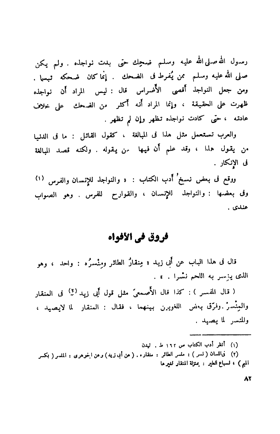 ووقع في بعض نسخ أدب الكتاب: "والنواجذ للإنسان والفرس وفي بعضها: والنواجذ للإنسان، والقوارح للفرس. وهو الصواب عندي.