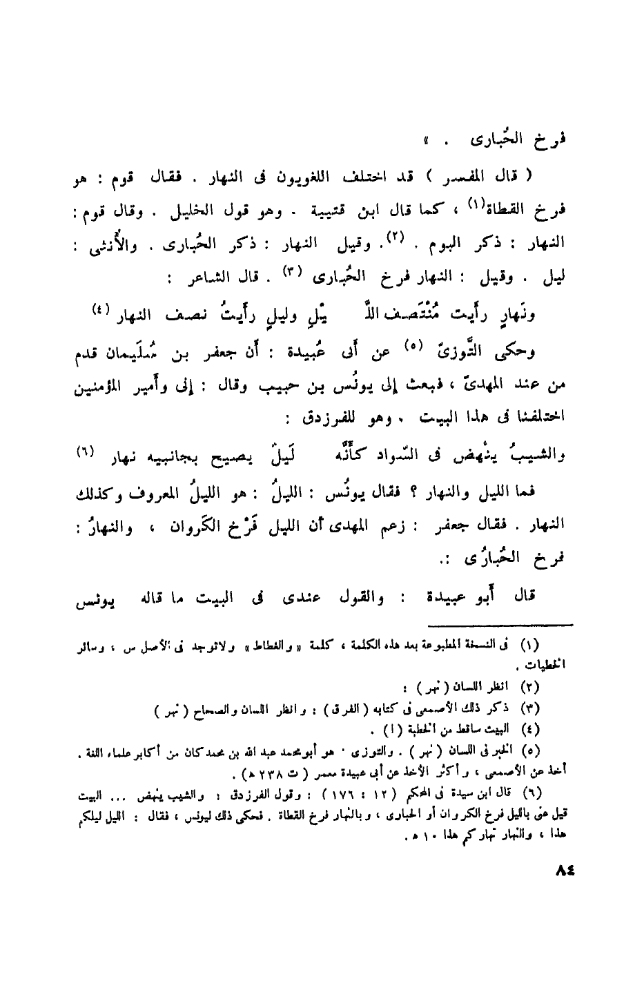 (قال المفسر): قد اختلف اللغويون في النهار. فقال قوم: هو فرخ القطاة، كما قال ابن قتيبة، وهو قول الخليل. وقال قوم: النهار: ذكر البوم. وقيل النهار: ذكر الحُبارى. والأنثى: ليل. وقيل: النهار فرخ الحُباري. قال الشاعر: