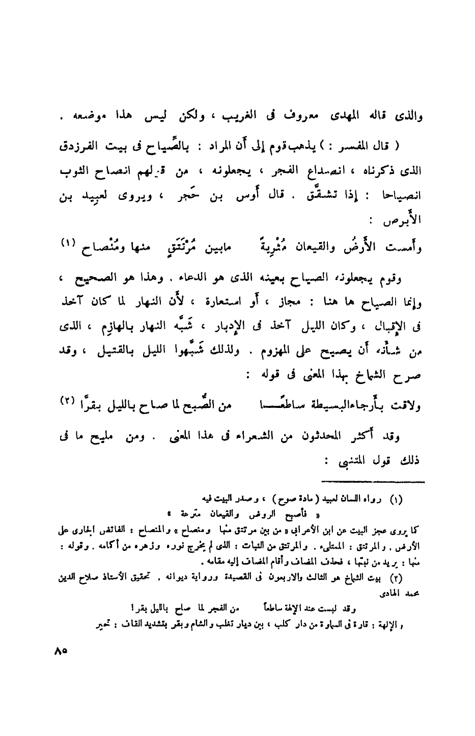 (قال المفسر:) يذهب قوم إلى أن المراد: بالصياح في بيت الفرزدق الذي ذكرناه، انصداع الفجر، يجعلونه، من قولهم انصاح الثوب انصياحاً: إذا تشقق. قال أوس بن حجر، ويروي لعبيد بن الأبرص: