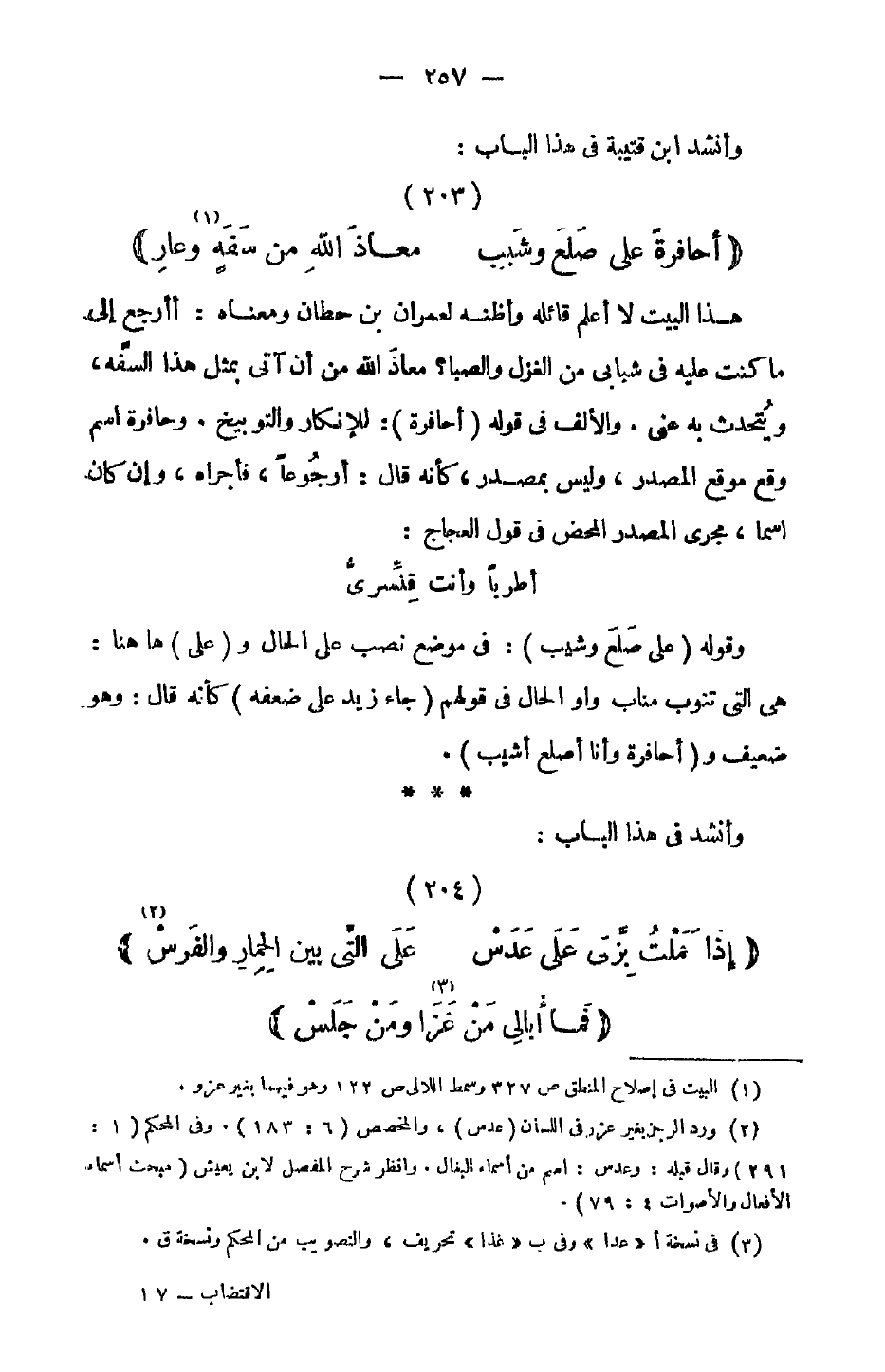 هذا البيت لا أعلم قائله وأظنه لعمران بن حطان ومعناه: أأرجع إلى ما كنت عليه في شبابي من الغزل والصبا؟ معاذ الله من أن آتي بمثل هذا السفه، ويتحدث به عني. والألف في قوله (أحافرة): للإنكار والتوبيخ. وحافرة اسم وقع موقع المصدر، وليس بمصدر، كأنه قال: أرجوعاً، فأجراه، وإن كان اسماًن مجرى المصدر المحض في قول العجاج:
