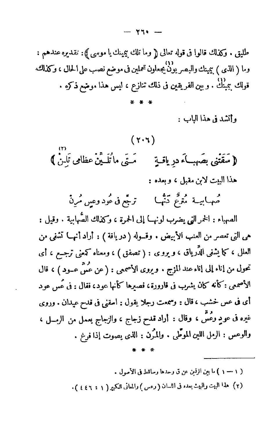 الصهباء: الخمر التي يضرب لونها إلى الحمرة، وكذلك الصهابية. وقيل: هي التي تعصر من العنب الأبيض. وقوله (درياقة): أراد أنها تشفى من العلل، كما يشفى الدرياق، ويروى: (تصفق)، ومعناه كمعنى ترجع، أي تحول من إناء إلى إناء عند المزج. ويروى الأصمعي: (عن عس عود)، قال الأصمعي: كأنه كان يشرب في قارورة، فصيرها كأنها عود، فقال: في عس عود أي في عس خشب، قال: وسمعت رجلاً يقول: اسقني في قدح عيدان. وروى غيره في عود وعس، وقال: أراد قدح زجاج، والزجاجي عمل من الرمل، والوعس الرمل اللين الموطي. والمرن الذي يصوت إذا فرغ.