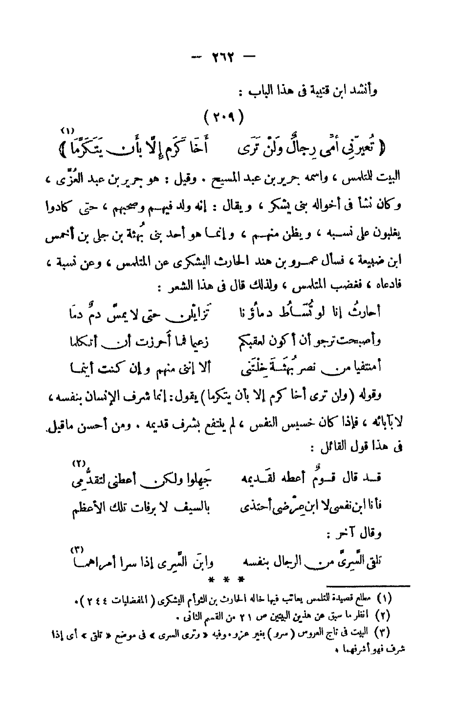 وقوله (ولن ترى أخا كرم إلا بأن يتكرما) يقول: غنما شرف الإنسان بنفسه، لا بآبائه، فإذا كان خسيس النفس، لم ينتفع بشرف قديمه. ومن أحسن ما قيل في هذا قول القائل: