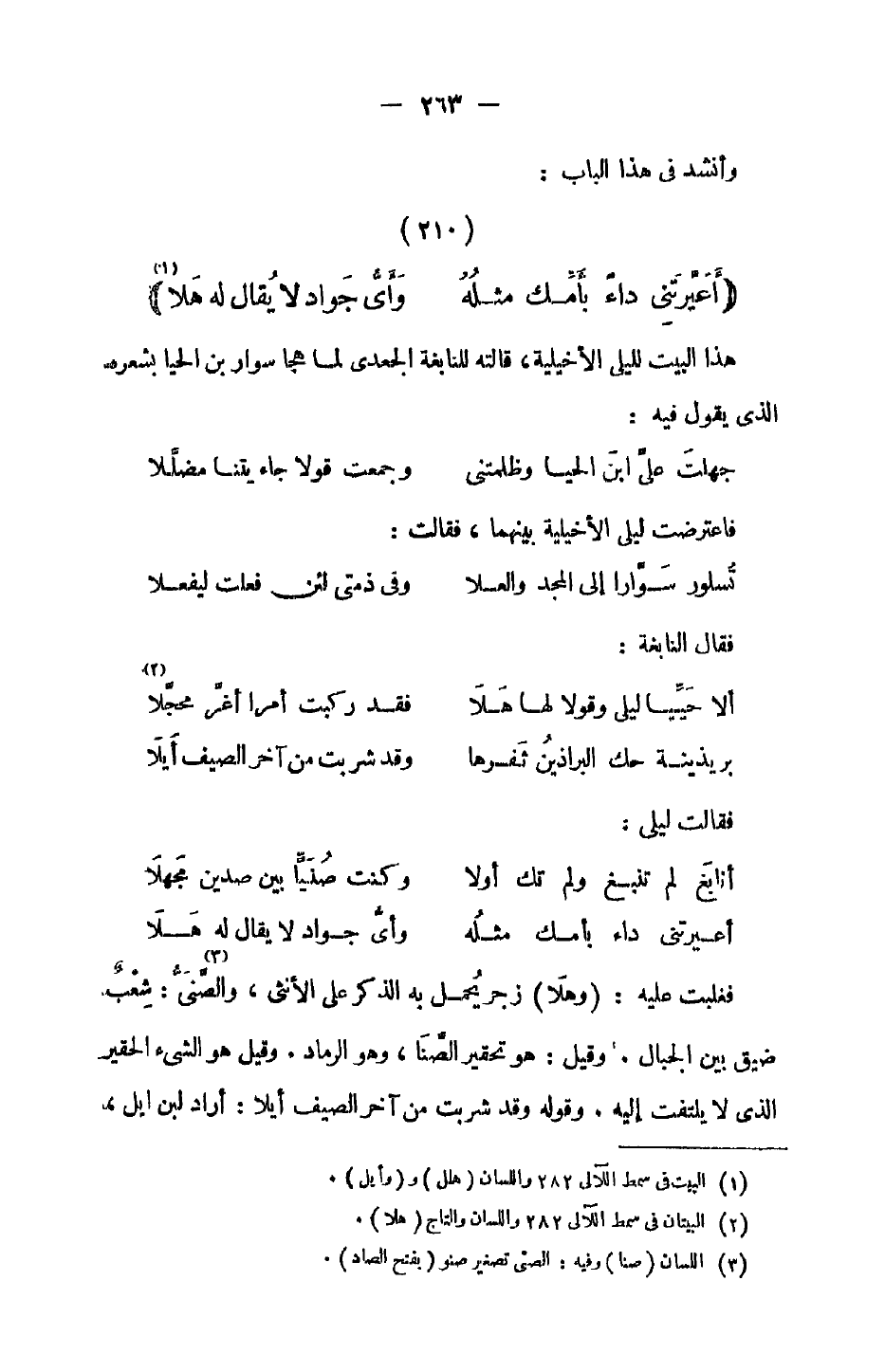 فغلبت عليه: (وهلا) زجر يحمل به الذكر على الأنثى، والصنى: شعب ضيق بين الجبال. وقيل: هو تحقير الصنا، وهو الرماد. وقيل هو الشيء الحقير الذي لا يلتفت إليه. وقوله وقد شربت من آخر الصيف أيلا: أراد لبن إيل،