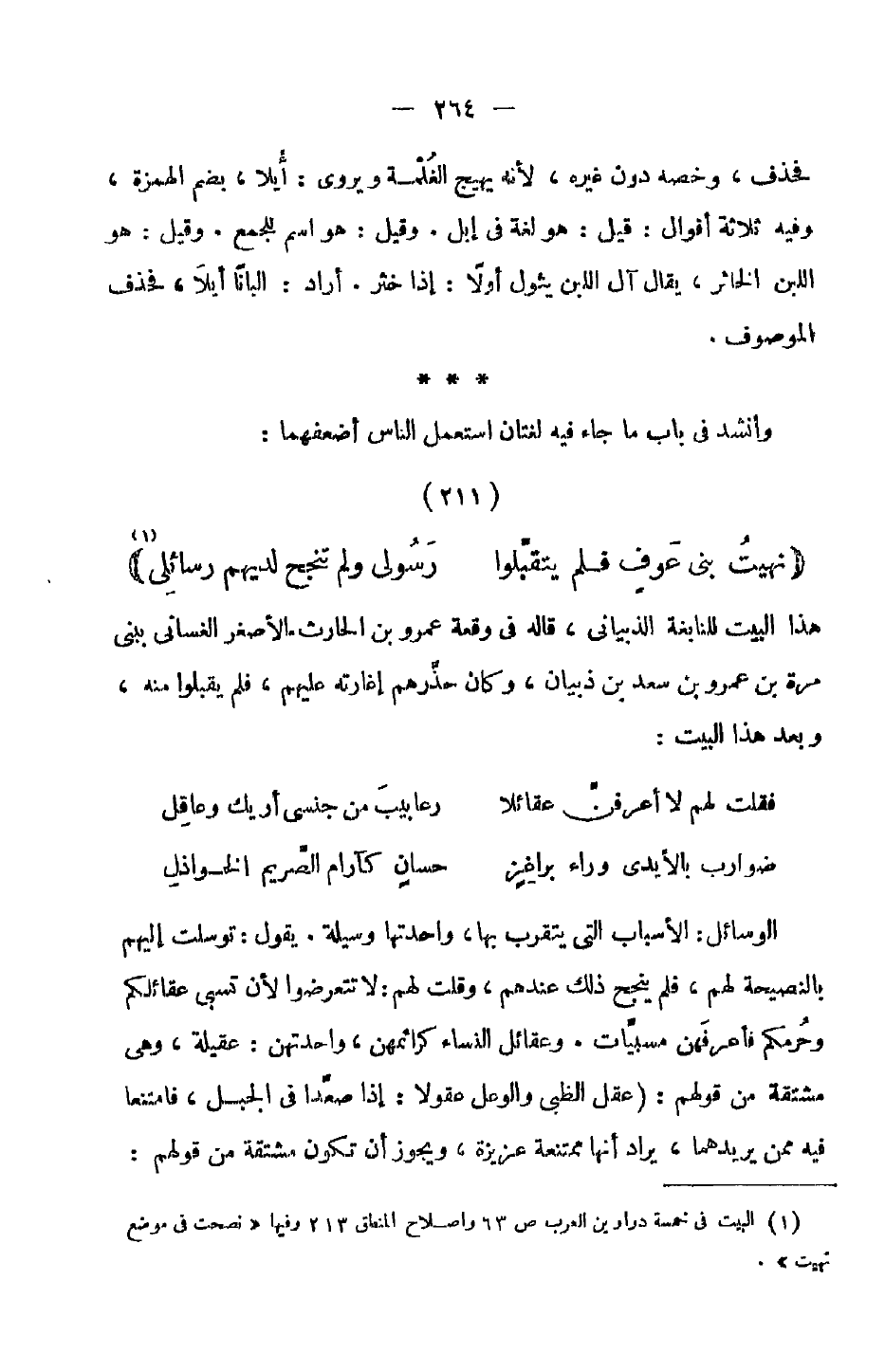 وأنشد في باب ما جاء فيه لغتان استعمل الناس أضعفهما: