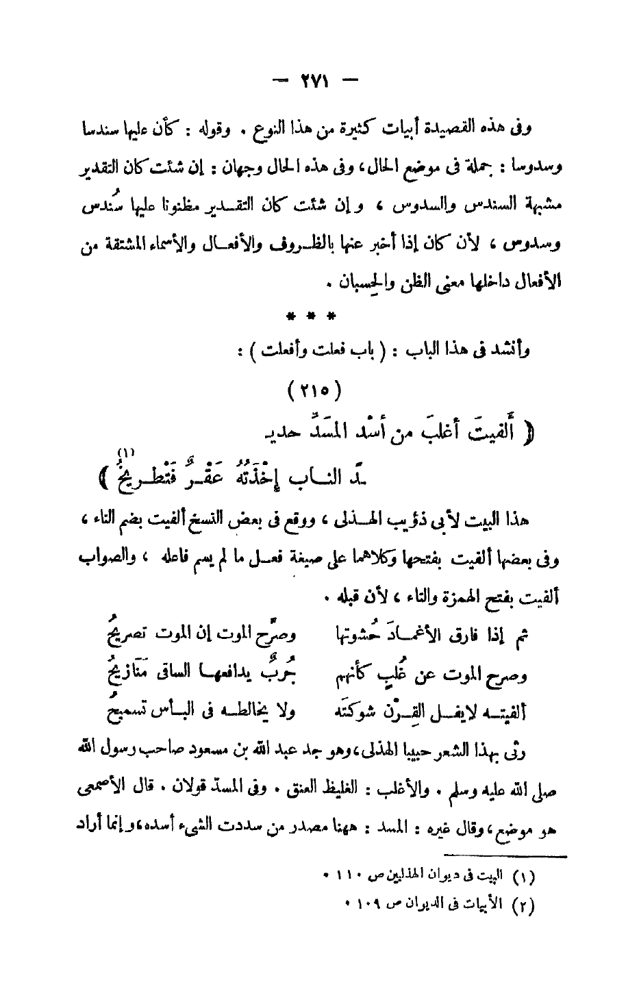 رثى بهذا الشعر حبيباً الهذلي، وهو جد عبد الله بن مسعود صاحب رسول الله صلى الله عليه وسلم. والأغلب: الغلي العنق. وفي المسد قولان. قال الأصمعي هو موضع، وقال غيره المسد: ههنا مصدر من سددت الشيء أسده، وإنما أراد
