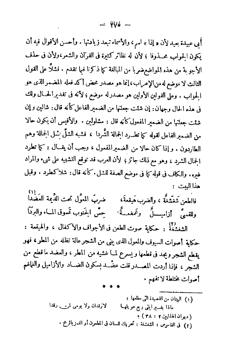 أبي عبيدة بعيد لأن "إذا" اسم، والأسماء تبعد زيادتها. وأحسن الأقوال فيه أن يكون الجواب محذوفاً؛ لأن له نظائر كثيرة في القرآن والشعر، ولأن في حذف الأجوبة من هذه المواضع ضرباً من المبالغة كما ذرنا فيما تقدم. فشلا على القول الثالث لا موضع له من الإعراب، غنما هو مصدر محض أكد فعله المضمر الذي هو الجواب. وعلى القولين الأولين هو مصدر له موضع؛ لأنه في تقدير الحال ولك في هذه الحال وجهان: عن شئت جعلتها من الضمير الفاعل كأنه قال: شالين وغن شئت جعلتها من الضمير المفعول كأنه قال: مشلولين. والأقيس أن يكون حالاً من الضمير الفاعل لقوله ما تطرد الجمالة الشردا، فشبه الشل بشل الجمالة وهم الطاردون. وإذا كان حالاً من الضمير المفعول، وجب أن يقال كما تطرد الجمال الشرد، وهو مع ذلك جائز؛ لأن العرب قد توقع التشبيه على شيء والمراد غيره، والكاف في قوله كما في موضع الصفة للشل. كأنه قال: شلا كطرد. وقبل هذا البيت: