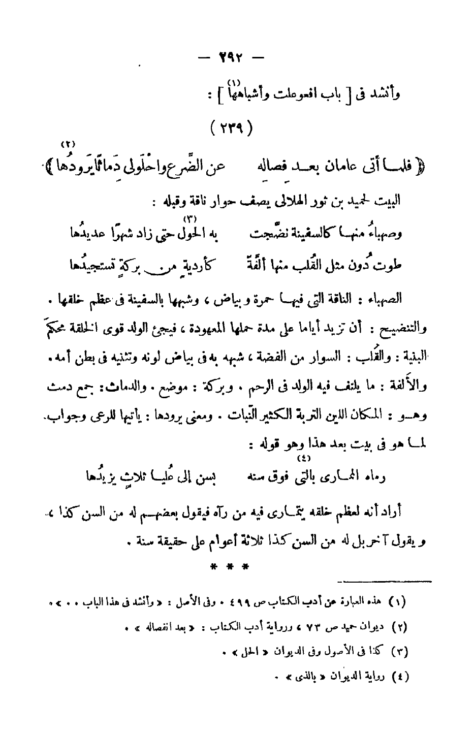 الصهباء: الناقة التي فيها حمرة وبياض، وشبهها بالسفينة في عظم خلقها. والتنضيح: أن تزيد أياماً على مدة حملها المعهودة، فيجيء الولد قوى الخلقة محكم البنية: والقلب السوار من الفضة، شبهه به في بياض لونه وتثنيه في بطن أمه. والألفة ما يلتف فيه الولد في الرحم. وبركة: موضع. والدماث: جمع دمث وهو: المكان اللين التربة الكثير النبات. ومعنى يرودها: يأتيها للرعي وجواب لما هو في بيت بعد هذا وهو قوله: