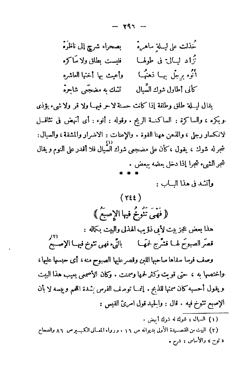 يقال ليلة طلق وطلقة إذا اكنت حسنة لا حر فيها ولا قر ولا شيء يؤذي ويكره، والساكرة: الساكنة الريح. وقوله: أنوء: أي أنهض من تثاقل لانكسار رجلي، والذهن ههنا القوة. والإعنات: الإضرار والمشقة، والسيال: شجر له شوك، يقول، كأن على مضجعي شوك السيال فلا أقدر على النوم ويقال شجر الشيء شجرا إذا دخل بعضه ببعض.