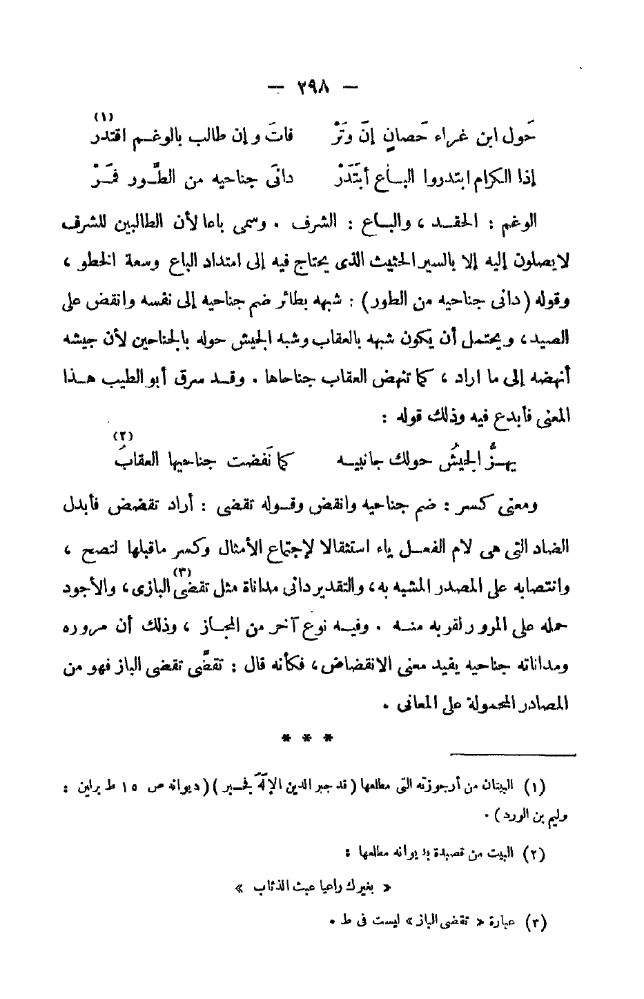 الوغم: الحقد، والباع: اشرف، وسمى باعاً لأن الطالبين للشرف لا يصلون إليه إلا بالسير الحثيث الذي يحتاج فيه إلى امتداد الباع وسعة الخطو، وقوله (دانى جناحيه من الطور): شبهه بطائر ضم جناحيه إلى نفسه وانقض على الصيد، ويحتمل أن يكون شبهه بالعقاب وشبه الجيش حوله بالجناحين لأن جيشه أنهضه إلى ما أراد، كما تنهض العقاب جناحاها. وقد سرق أبو الطيب هذا المعنى فأبدع فيه وذلك قوله