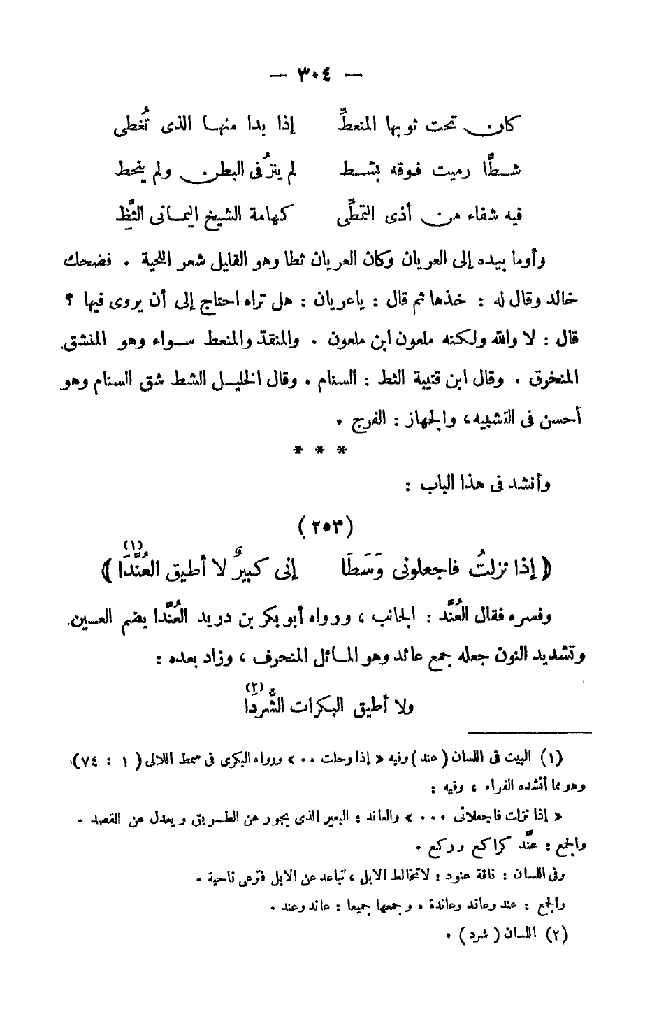 وأوما بيده إلى العريان وكان العريان ثطا وهو القليل شعر اللحية. فضحك خالد وقال له: خذها ثم قال: يا عريان: هل تراه احتاج إلى أن يروى فيها؟ قال: لا والله ولكنه ملعون ابن ملعون. والمنقد والمنعط سواء وهو المنشق المنخرق. وقال ابن قتيبة الثط: السنام. وقال الخليل الشط شق السنام وهو أحسن في التشبيه، والجهاز: الفرج.