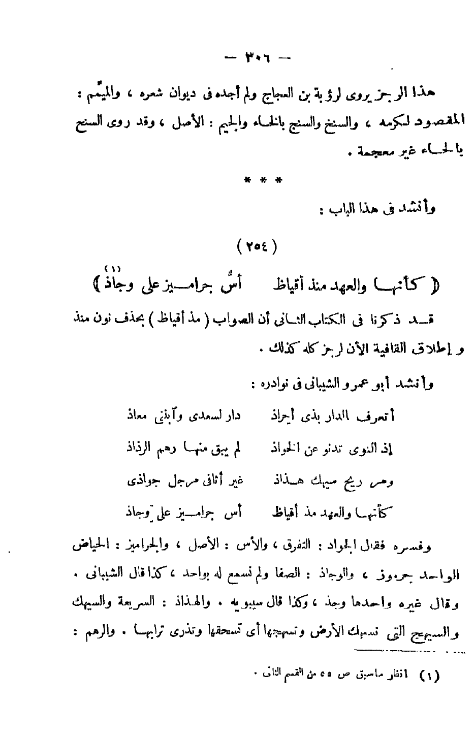 وفسره فقال الجواد: التفرقن والأس: الأصل، والجراميز: الحياض الواحد جرمز، والوجاذ: الصفا ولم نسمع له بواحد، كذا قال الشيباني. وقال غيره واحدها وجذ، وكذا قال سيبويه. والهذاذ: السريعة والسيهك والسيهج التي نسهك الأرض وتسجها أي تسحقها وتذرى ترابها. والرهم: