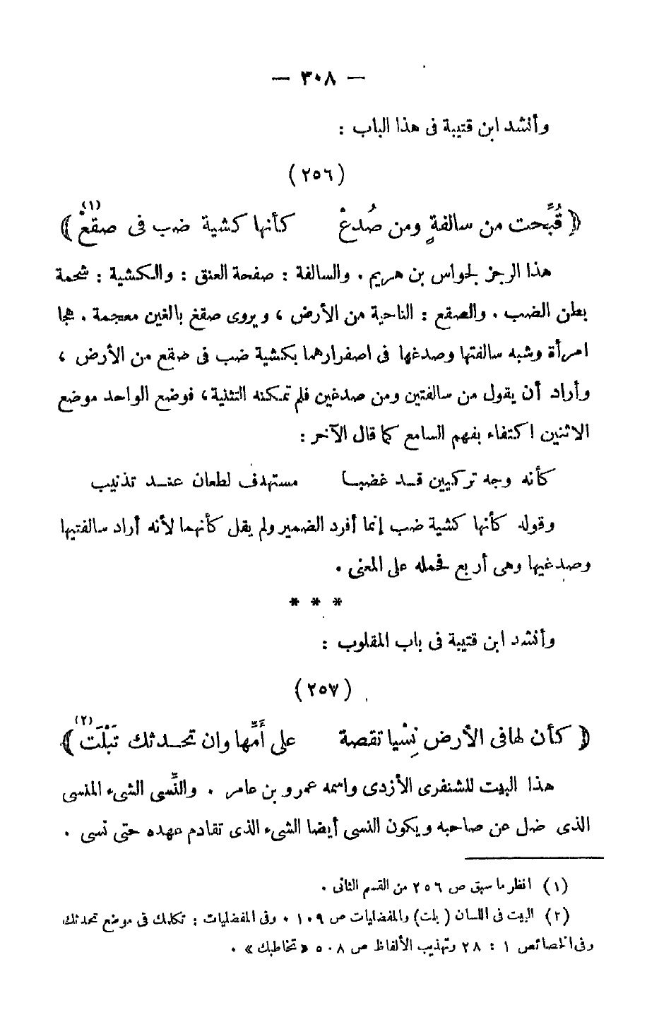 هذا الرجز لجواس بن هريم. والسالفة: صفحة العنق: والكشية: شحمة بطن الضب. والصقع: الناحية من الأرض، ويروى صقغ بالغين معجمة. هجا امرأة وشبه سالفتها وصدغها في اصفرارهما بكشية ضب في صقع من الأرض، وأراد أن يقول من سالفتين ومن صدغين فلم تمكنه التثنية، فوضع الواحد موضع الاثنين اكتفاء بفهم السامع كما قال الآخر: