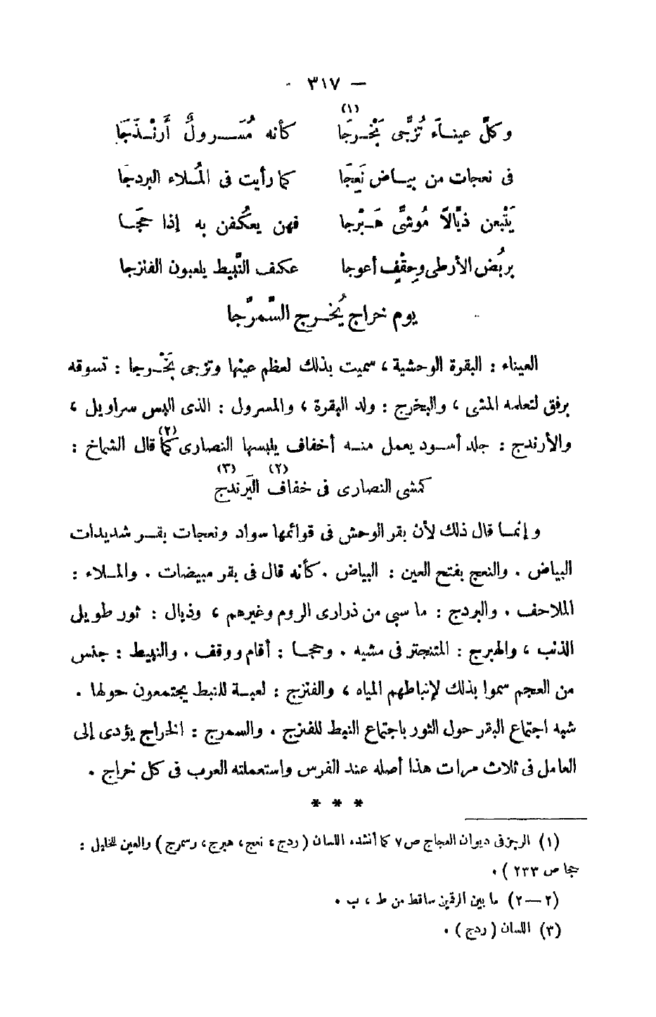 العيناء: البقرة الوحشية، سميت بذلك لعظم عينها وتزجى بخرجا: تسوقه برفق لتعلمه المشي، والبخرج: ولد البقرة، والمسرول: الذي البس سراويل، والأرندج: جلد أسود يعمل منه أخفاف يلبسها النصارى كما قال الشماخ: