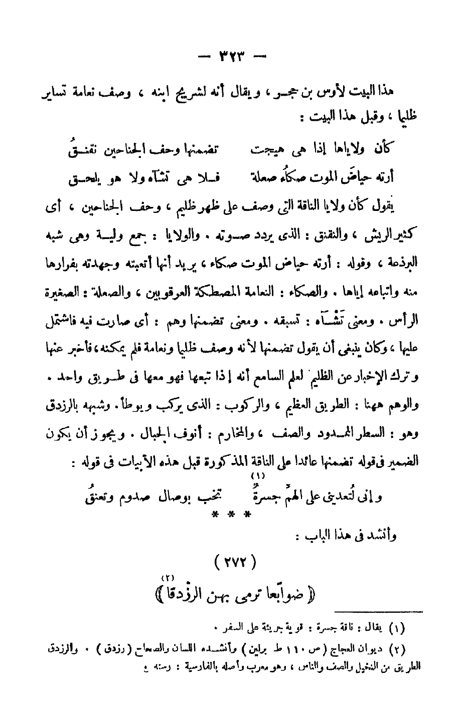 يقول كأن ولايا الناقة التي وصف على ظهر ظليم، وحف الجناحين، أي كثير الريش، والنقنق: الذي يردد صوته. والولايا: جمع ولية وهي شبه البرذعة، وقوله: أرته حياض الموت صكاء، يريد أنها أتعبته وجهدته بفرارها منه واتباعه إياها. والصكاء: النعامة المصطكة العرقوبين، والصعلة: الصغيرة الرأس. ومعنى تشآه: تسبقه. ومعنى تضمنها وهم: أي صارت فيه فاشتمل عليها، وكان ينبغي أن يقول تضمنها لأنه وصف ظليماً ونعامة فلم يمكنه، فأخبر عنها وترك الإخبار عن الظليم لعلم السامع أنه إذا تبعها فهو معها في طريق واحد. والوهم ههنا: الطريق العظيم، والركوب: الذي يركب ويوطأ. وشبهه بالرزدق وهو: السطر الممدود والصف، والمخارم: أنوف الجبال. ويجوز أن يكون الضمير في قوله تضمنها عائداً على الناقة المذكورة قبل هذه الأبيات في قوله