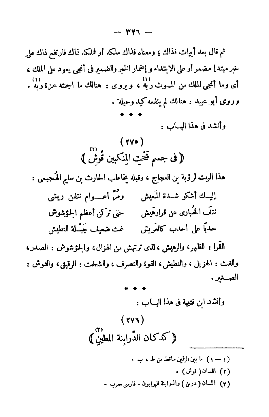 القرا: الظهر، والهريش، لذي ترتهش من الهزال، والجؤشوش: الصدر، والغث: الهزيل، والنطيش، القوة والتصرف، والشخت: الرقيق، والقوش: الصغير.