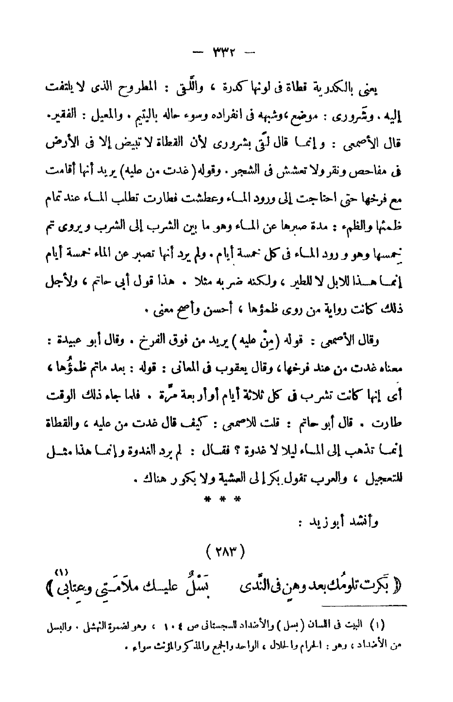 وقال الأصمعي: قوله (من عليه) يريد من فوق الفرخ. وقال أبو عبيدة: معناه غدت من عند فرخها، وقال يعقوب في المعاني: قوله: بعد ما تم ظمؤها، أي إنها كانت تشرب في كل ثلاثة أيام أو أربعة مرة. فلما جاء ذلك الوقت طارت. قال أبو حاتم: قلت للأصمعي: كيف قال غدت من عليه، والقطاة غنما تذهب إلى الماء ليلاً لا غدوة؟ فقال: لم يرد الغدوة وغنما هذا مثل للتعجيل، والعرب تقول بكر إلى العشية ولا بكور هناك.