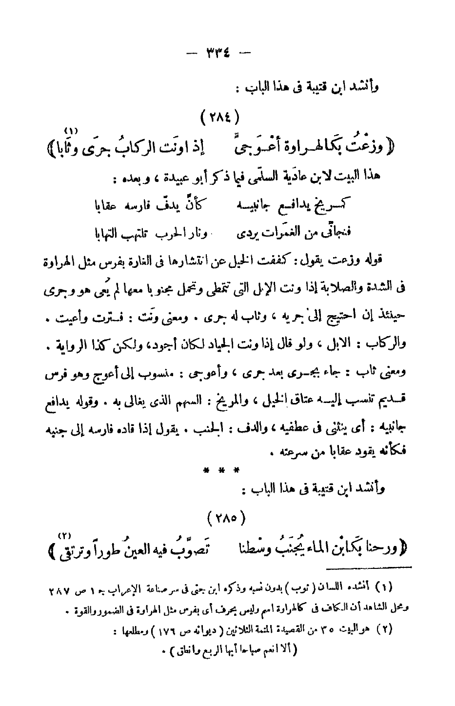 قوله وزعت يقول: ففت الخيل عن انتشارها في الغارة بفرس مثل الهراوة في الشدة والصلابة إذا ونت الإبل التي تتمطى وتحمل مجنوباً معها لم يعى هو وجرى حينئذ إن احتيج إلى جريه، وثاب له جرى. ومعنى ونت: فترت وأعيت. والركاب: الإبل، ولو قال إذا ونت الجياد لكان أجود، ولكن كذا الرواية. ومعنى ثاب: جاء يجرى بعد جرى، وأعوجي: منسوب إلى أعوج وهو فرس قديم تنسب إليه عتاق الخيل، والمريخ: السهم الذي يغالي به. وقوله يدافع جانبيه: أي ينثني في عطفيه، والدف: الجنب. يقول إذا قاده فارسه إلى جنبه فكأنه يقود عقاباً من سرعته.