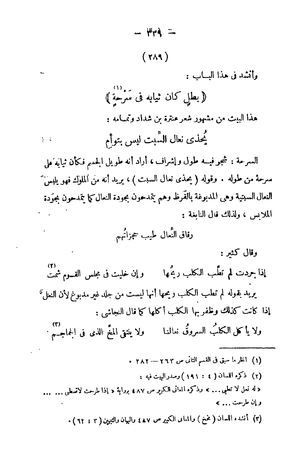 السرحة: شجو فيه طول وإشراف، أراد أنه طويل الجسم فكأن ثيابه على سرحة من طوله. وقوله (يحذى نعال السبت)، يريد أنه من الملوك فهو يلبس النعال السبتية وهي المدبوغة بالقرظ وهم يتمدحون بجودة النعلا كما يتمدحون بجودة الملابس، ولذلك قال النابغة: