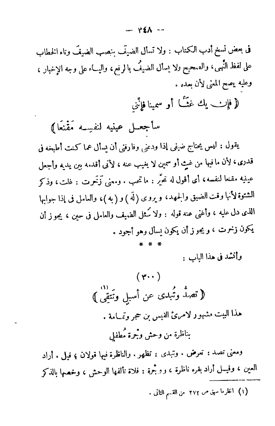 في بعض نسخ أدب الكتاب: ولا تسأل الضيف بنصب الضيف وتاء الخطاب على لفظ النهي، والصحيح ولا يسأل الضيف بالرفع، والياء على وجه الإخبار، وعليه يصح المعنى لأن بعده: