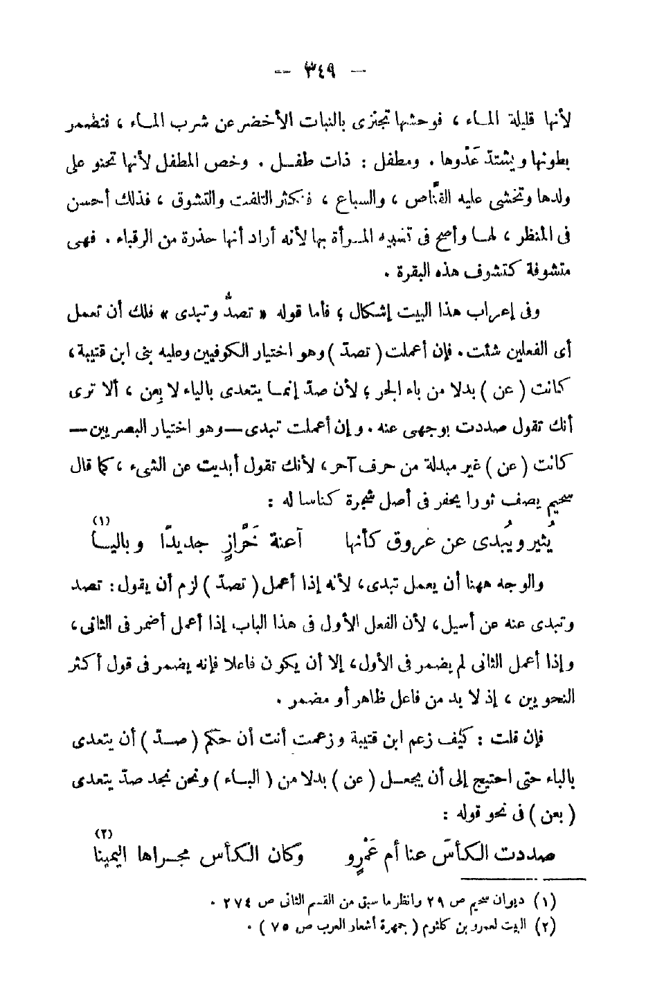وفي إعراب هذا البيت إشكال، فأما قوله "تصد وتبدى" فلك أن تعمل أي الفعلين شئت. فإن أعملت (تصد) وهو اختيار الكوفيين وعليه بني ابن قتيبة، كانت (عن) بدلاً من باء الجر، لأن صد إنما يتعدى بالياء لا بعن، ألا ترى أنك تقول صددت بوجهي عنه. وإن أعملت تبدى - وهو اختيار البصريين - كانت (عن) غير مبدلة من حرف آخر، لأنك تقول أبديت عن الشيء، كما قال سحيم يصف ثوراً يحفر في أصل شجرة كناساً له: