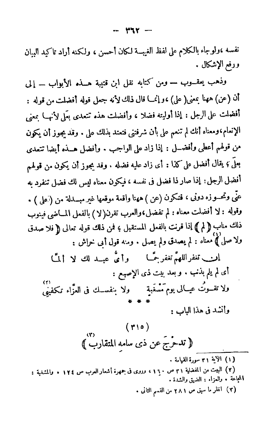 وذهب يعقوب - ومن كتابه نقل ابن قتيبة هذه الأبواب - إلى أن (عن) ههنا بمعنى (على)، وإنما قال ذل لأنه جعل قوله أفضلت من قوله: أفضلت على الرجل: إذا أوليته فضلاً، وأفضلت هذه تتعدى بعلى لأنها بمعنى الإنعام، ومعناه أنك لم تنعم علي بأن شرفتني فتعتد بذلك على. وقد يجوز أن يكون من قولهم أعطى وأفضل: إذا زاد على الواجب. وأفضل هذه أيضاً تتعدى بعلى؛ يقال أفضل على كذا: أي زاد عليه فضله. وقد يجوز أن يكون من قولهم أفضل الرجل: إذا صار ذا فضل في نفسه، فيكون معناه ليس لك فضل تنفرد به عني وتحوزه دوني، فتكون (عن) ههنا واقعة موقعها غير مبدلة من (على). وقوله: لا أفضلت معناه: لم تفضل، والعرب تقرن (لا) بالفعل الماضي فينوب ذلك مناب (لم) إذا قرنت بالفعل المستقبل؛ فمن ذلك قوله تعالى (فلا صدق ولا صلى) معناه: لم يصدق ولم يصل. ومنه قول أبي خراش: