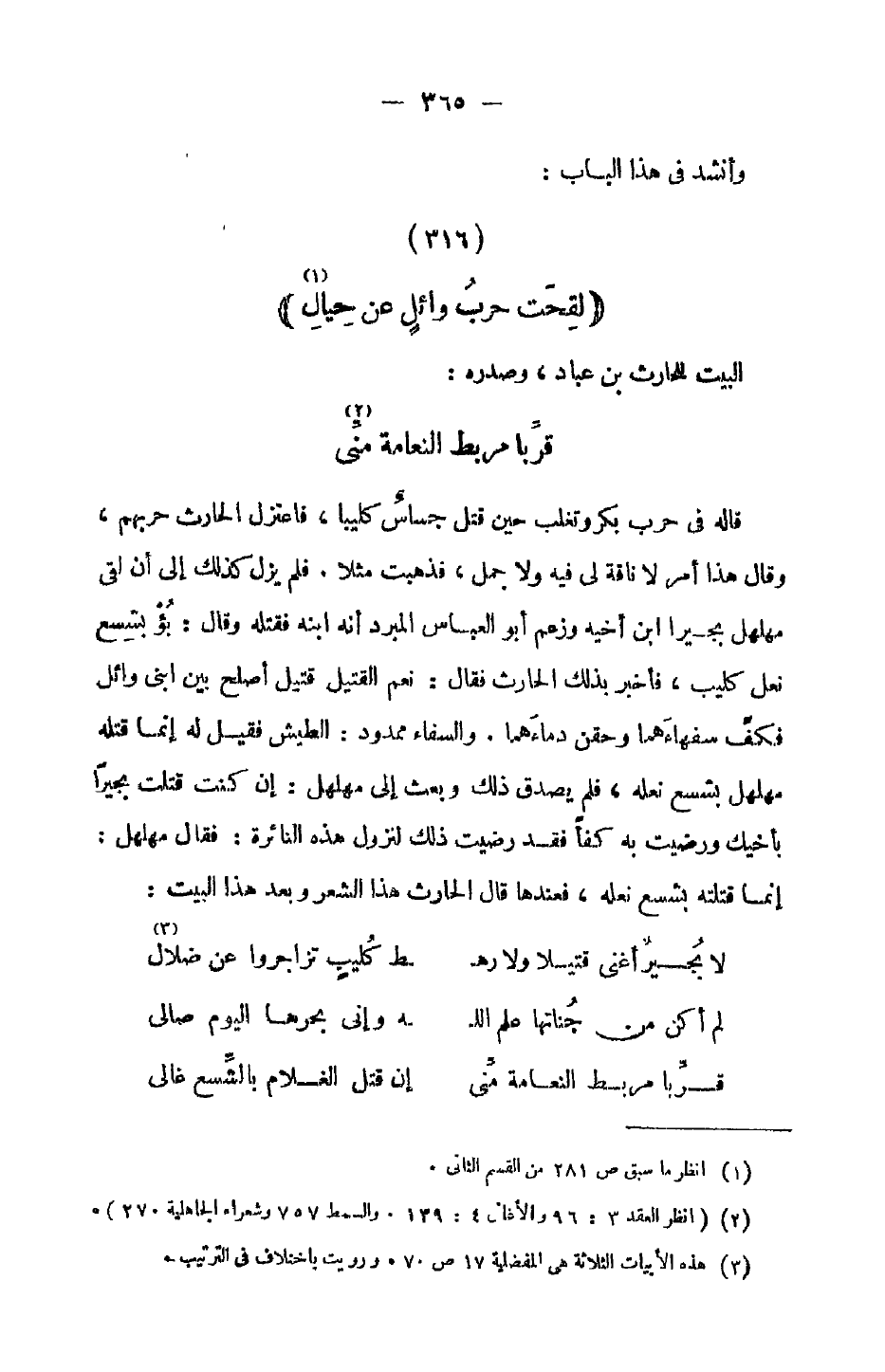قاله في حرب بكر وتغلب حين قتل جساس كليبا، فاعتزل الحارث حربهم، وقال هذا أمر لا ناقة لي فيه ولا جمل، فذهبت مثلاً. فلم يزل كذلك إلى أن لقي مهلهل بجيراً ابن أخيه وزعم أبو العباس المبرد أنه ابنه فقتله وقال: بؤ بشسع نعل كليب، فأخبر بذلك الحارث فقال: نعم القتيل قتيل أصلح بين ابني وائل فكف سفهاءهما وحقن دماءهما. والسفاء ممدود: الطيش فقيل له إنما قتله مهلهل بشسع نعله، فلم يصدق ذلك وبعث إلى مهلهل: إن كنت قتلت بجيراً بأخيك ورضيت به كفأ فقد رضيت ذلك لنزول هذه النائرة: فقال مهلهل: إنما قتلته بشسع نعله، فعندها قال الحارث هذا الشعر وبعد هذا البيت: