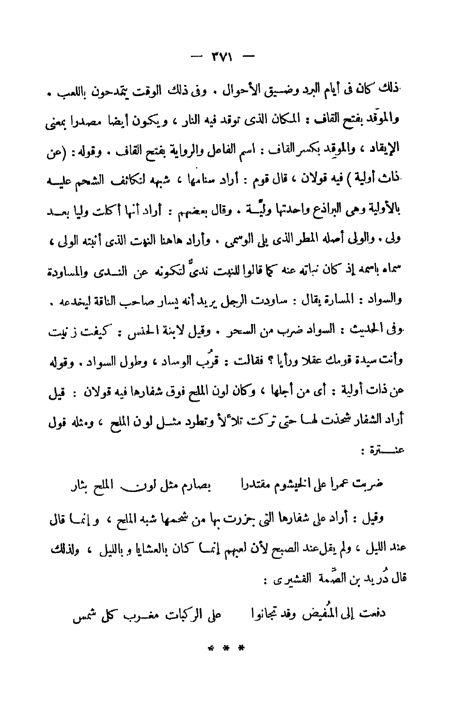 ذلك كان في أيام البرد وضيق الأحوال. وفي ذلك الوقت يتمدحون باللعب. والموقد بفتح القاف: المكان الذي توقد فيه النار، ويكون أيضاً مصدراً بمعنى الإيقاد، والموقد بكسر القاف: اسم الفاعل والرواية بفتح القاف. وقوله: (عن ذات أولية) فيه قولان، قال قوم: أراد سنامها، شبهه لتكاثف الشحم عليه بالأولية وهي البراذع واحدتها ولية. وقال بعضهم: أراد أنها أكلت وليا بعد ولي. والولي أصله المطر الذي يلي الوسمى. وأراد هاهنا النبت الذي أنبته الولي، سماه باسمه إذ كان نباته عنه كما قالوا للنبت ندى لتكونه عن الندى والمساودة والسواد: المسارة يقال: ساودت الرجل يريد أنه يسار صاحب الناقة ليخدعه. وفي الحديث السواد ضرب من السحر. وقيل لابنة الحنس: كيف زنيت وأنت سيدة قومك عقلاً ورأياً؟ فقالت: قرب الوساد، وطول السواد. وقوله عن ذات أولية: أي من أجلها، وكان لون الملح فوق شفارها فيه قولان: قيل أراد الشفار شحذت لها حتى ترت تلألأ وتطرد مثل لون الملح، ومثله قول عنترة: