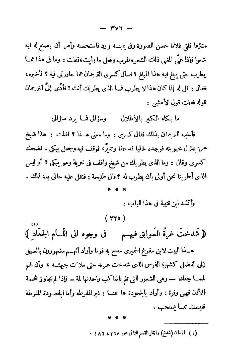 متنزها فلقي غلاماً حسن الصورة وفي يمينه ورد فاستحسنه وأمر أن يصنع له فيه شعراً فإذا غني المغني ذلك الشعر، طرب وفعل ما رأيت، فقلت: وما في هذا مما يطرب حتى يبلغ فيه هذا المبلغ؟ فسأل كسرى الترجمان عما حاورني فيه؟ فأخبره، فقال: قل له إذا كان هذا لا يطرب فما الذي يطربك أنت؟ فأدى على الترجمان قوله فقلت قول الأعشى: