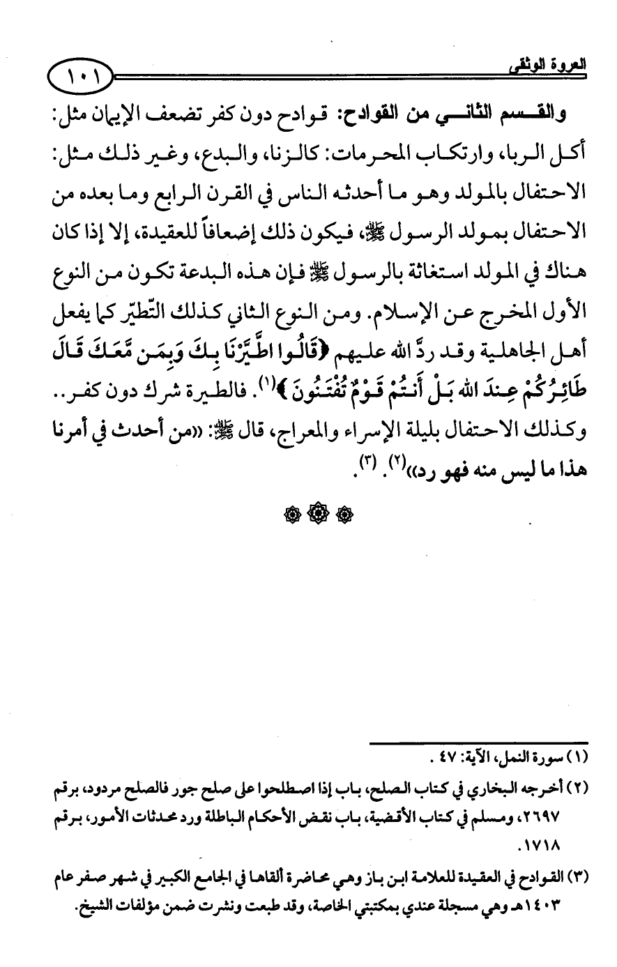 (¬3) القوادح في العقيدة للعلامة ابن باز وهي محاضرة ألقاها في الجامع الكبير في شهر صفر عام 1403هـ وهي مسجلة عندي بمكتبتي الخاصة، وقد طبعت ونشرت ضمن مؤلفات الشيخ.