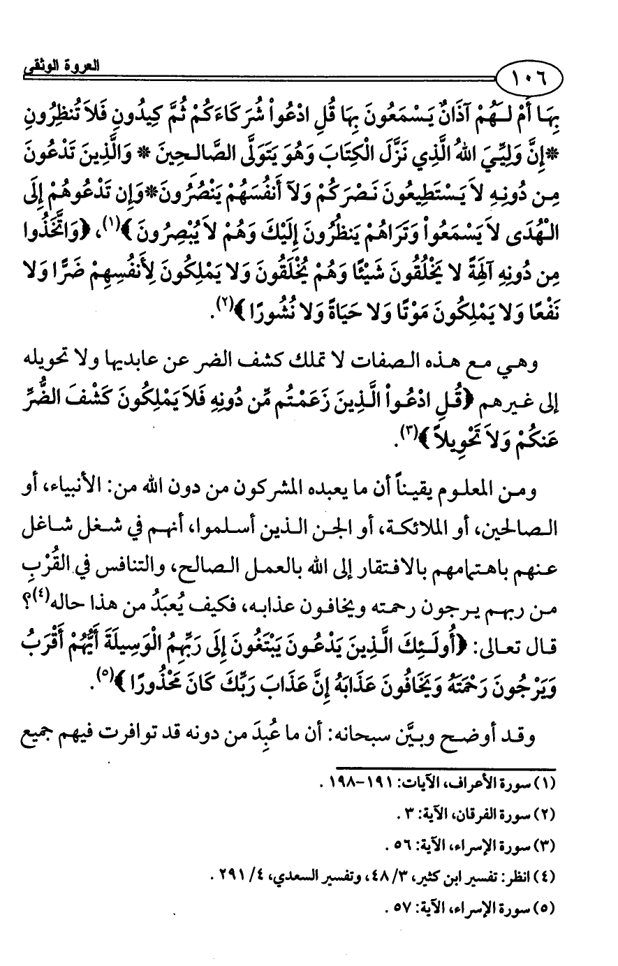 بِهَا أَمْ لَهُمْ آذَانٌ يَسْمَعُونَ بِهَا قُلِ ادْعُواْ شُرَكَاءَكُمْ ثُمَّ كِيدُونِ فَلاَ تُنظِرُونِ *إِنَّ وَلِيِّيَ الله الَّذِي نَزَّلَ الْكِتَابَ وَهُوَ يَتَوَلَّى الصَّالِحِينَ * وَالَّذِينَ تَدْعُونَ مِن دُونِهِ لاَ يَسْتَطِيعُونَ نَصْرَكُمْ وَلآ أَنفُسَهُمْ يَنْصُرُونَ*وَإِن تَدْعُوهُمْ إِلَى الْهُدَى لاَ يَسْمَعُواْ وَتَرَاهُمْ يَنظُرُونَ إِلَيْكَ وَهُمْ لاَ يُبْصِرُونَ} (¬1)، {وَاتَّخَذُوا مِن دُونِهِ آلِهَةً لا يَخْلُقُونَ شَيْئًا وَهُمْ يُخْلَقُونَ وَلا يَمْلِكُونَ لِأَنفُسِهِمْ ضَرًّا وَلا نَفْعًا وَلا يَمْلِكُونَ مَوْتًا وَلا حَيَاةً وَلا نُشُورًا} (¬2).