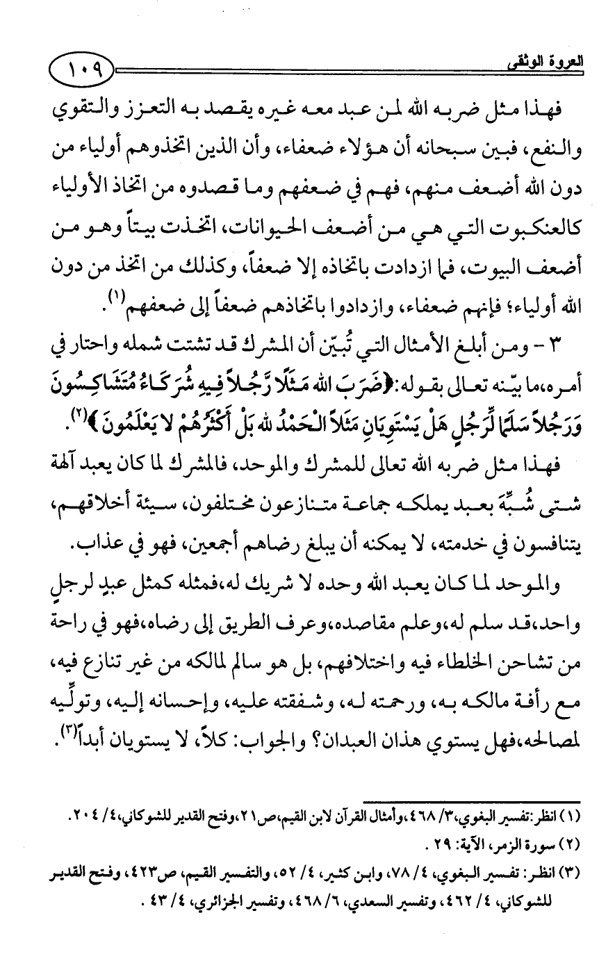 3 - ومن أبلغ الأمثال التي تُبيّن أن المشرك قد تشتت شمله واحتار في أمره، ما بيّنه تعالى بقوله: {ضَرَبَ الله مَثَلًا رَّجُلاً فِيهِ شُرَكَاءُ مُتَشَاكِسُونَ وَرَجُلاً سَلَمًا لِّرَجُلٍ هَلْ يَسْتَوِيَانِ مَثَلاً الْحَمْدُ لله بَلْ أَكْثَرُهُمْ لا يَعْلَمُونَ} (¬2).