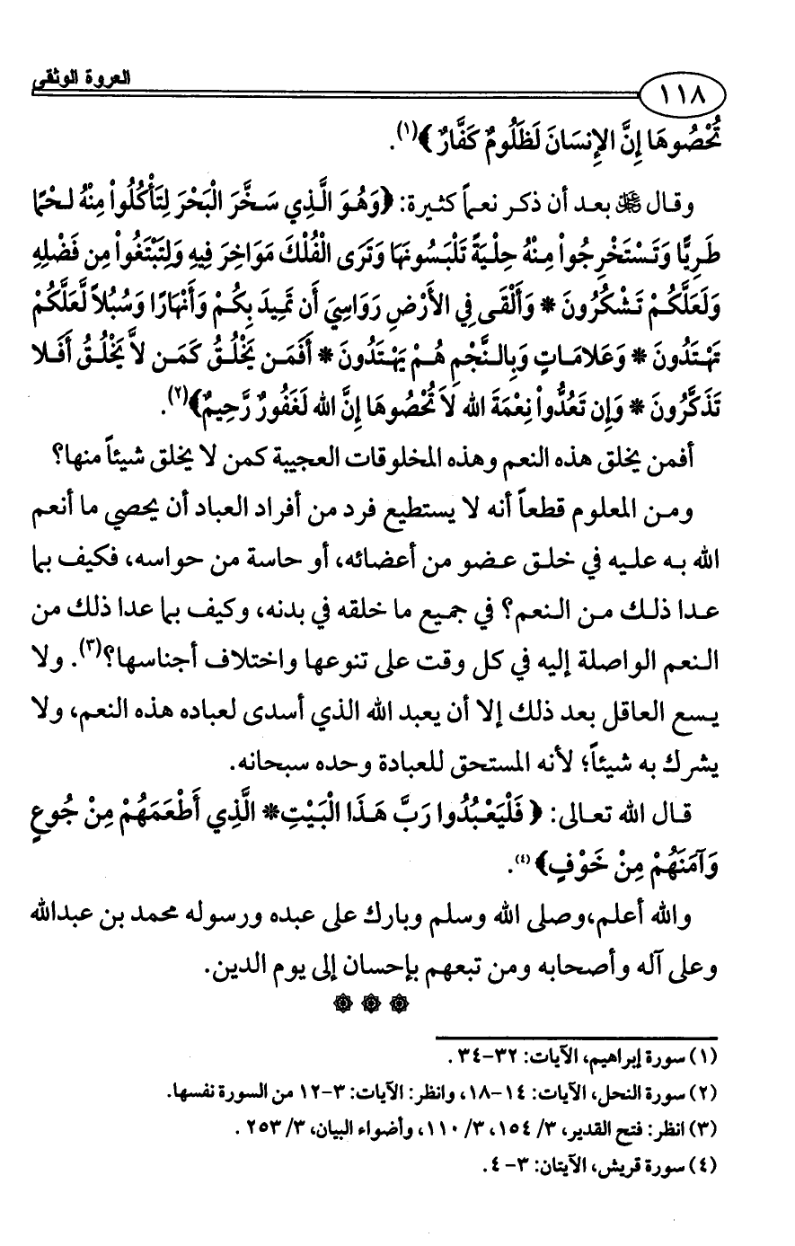 ومن المعلوم قطعاً أنه لا يستطيع فرد من أفراد العباد أن يحصي ما أنعم الله به عليه في خلق عضو من أعضائه، أو حاسة من حواسه، فكيف بما عدا ذلك من النعم؟ في جميع ما خلقه في بدنه، وكيف بما عدا ذلك من النعم الواصلة إليه في كل وقت على تنوعها واختلاف أجناسها؟ (¬3). ولا يسع العاقل بعد ذلك إلا أن يعبد الله الذي أسدى لعباده هذه النعم، ولا يشرك به شيئاً؛ لأنه المستحق للعبادة وحده سبحانه.