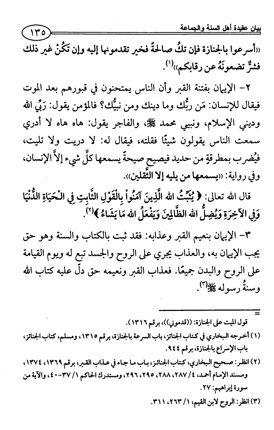 (¬2) انظر: صحيح البخاري، كتاب الجنائز، باب ما جاء في عذاب القبر، برقم 1369، 1374، ومسند الإمام أحمد، 4/ 287، 288، 295، 296، ومستدرك الحاكم 1/ 37 - 40، والآية من سورة إبراهيم: 27.